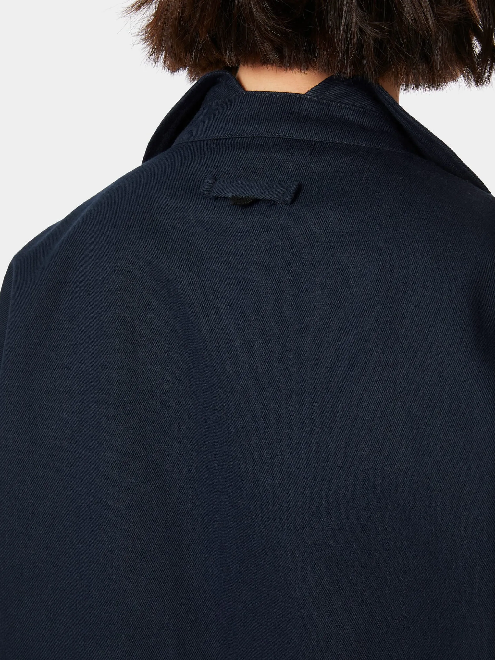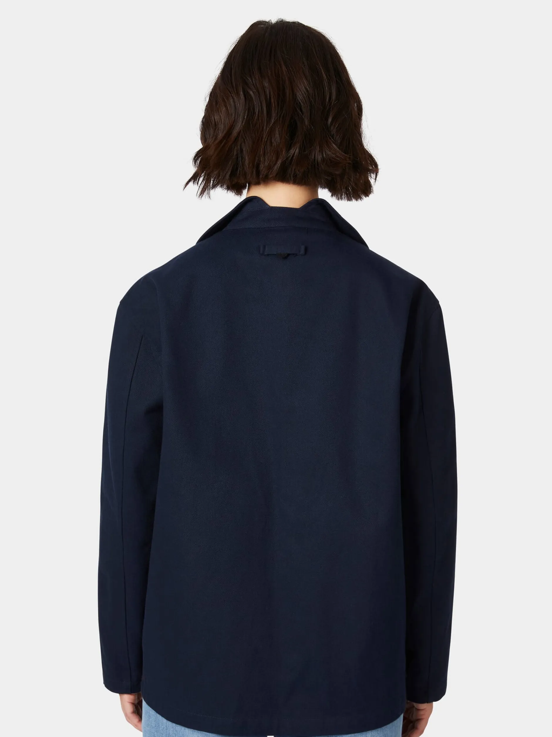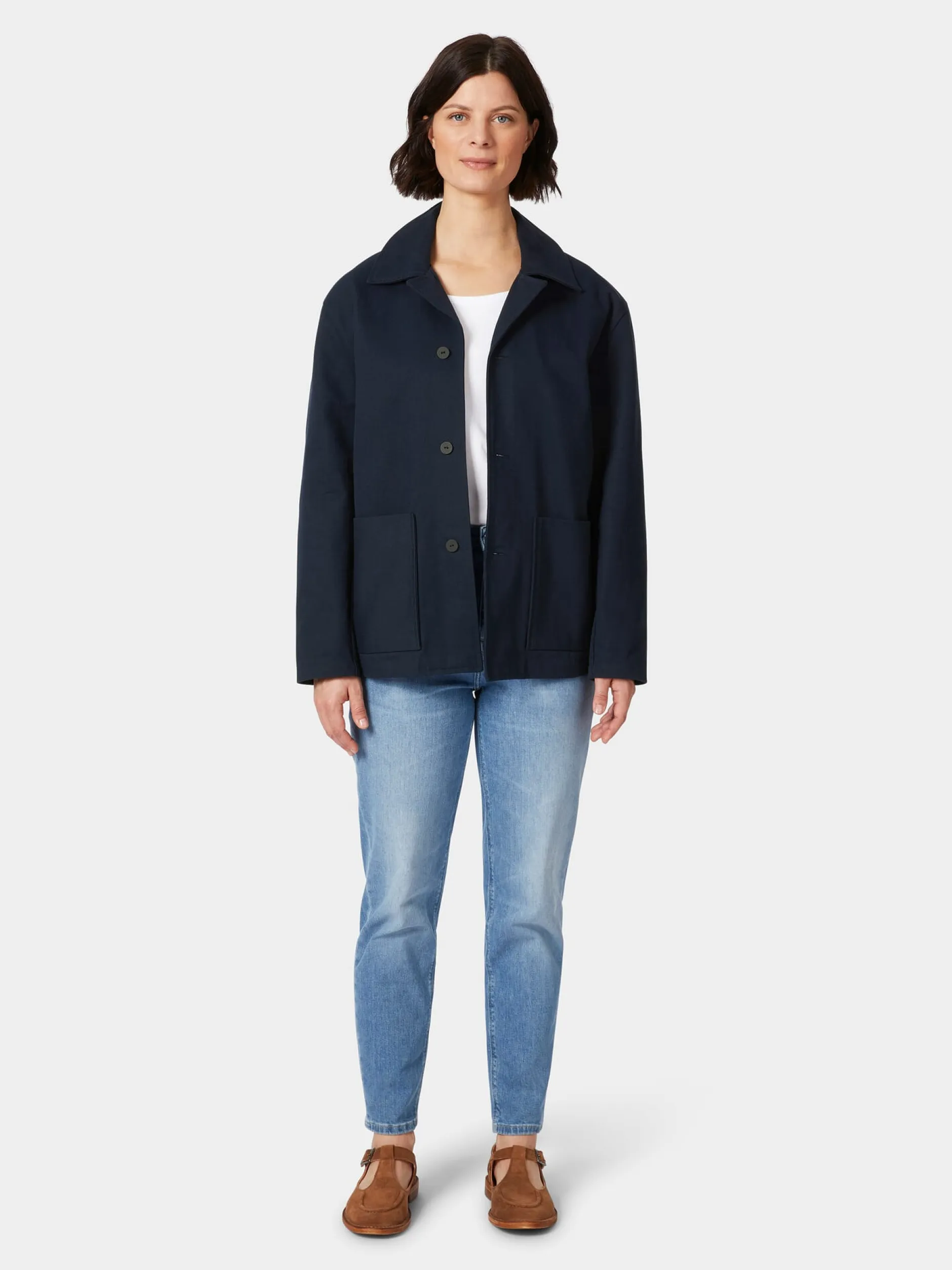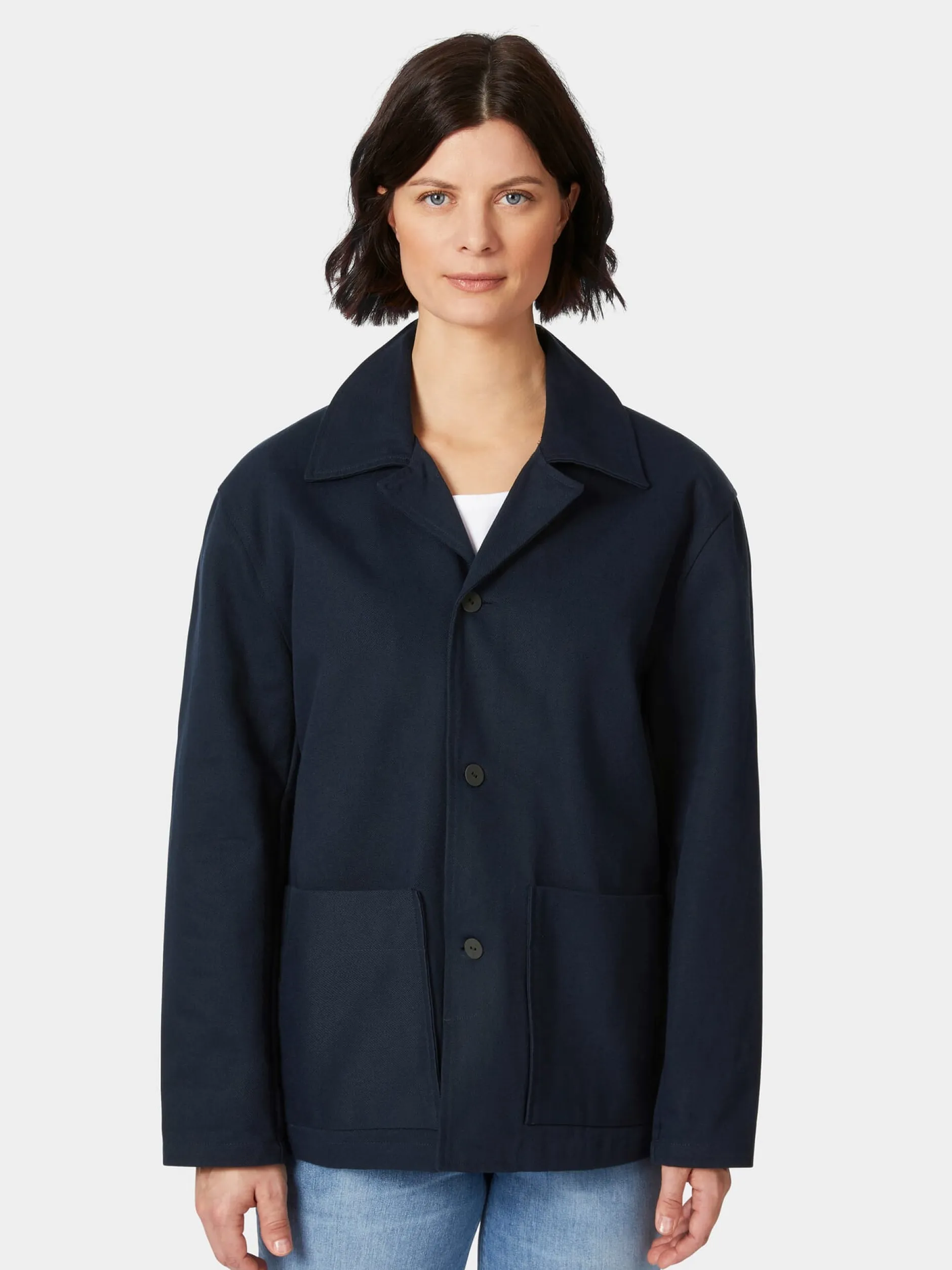 Diese gerade geschnittene Damenjacke im Stil einer Arbeitsjacke punktet durch ihre bequeme Passform und ihre lässige Optik. Für den robusten Twill verwendet Christiane Strobel hautsympathische, kontrolliert biologisch angebaute Baumwolle. Das dichte Gewebe hat einen kräftigen Griff und zeigt einen deutlichen, schräg verlaufenden Köpergrat. Ausgestattet ist die Jacke mit zwei großen aufgesetzten Taschen und markanten, in Japan handgefertigten Papierknöpfen. Besonders ist auch der Kragen, der vorn als Reverskragen erscheint und im Nacken unterbrochen ist, wodurch dort nur der Kragensteg sichtbar ist.