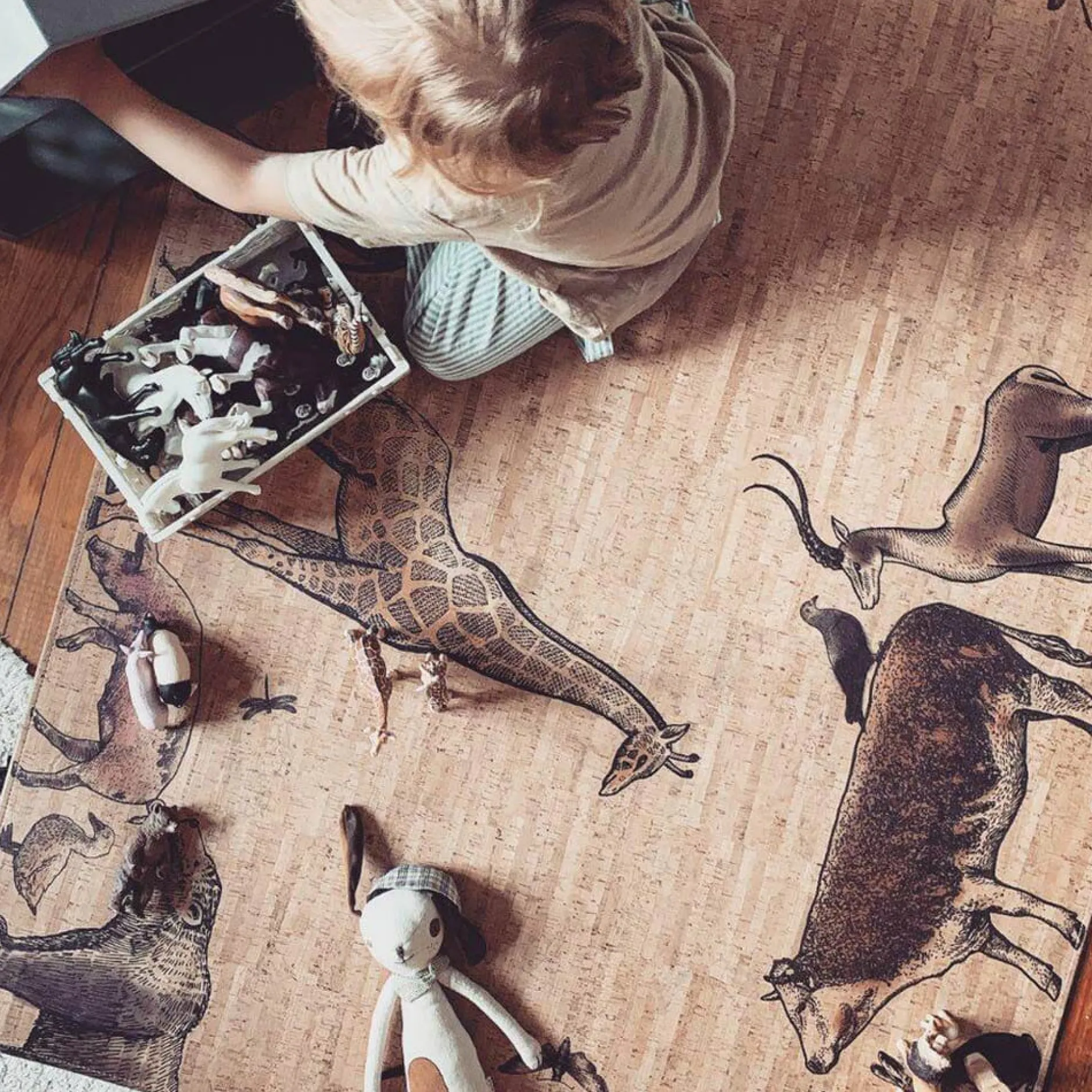 Die Oberseite des Teppichs besteht aus sogenanntem Korkleder, also reinem Kork – von portugiesischen Korkeichen gewonnen –, der auf einen Baumwollträger kaschiert wird. Diese Korklederfläche zeichnet sich durch eine besonders warme, schmiegsame Haptik aus, sodass sich Ihr Kind von klein auf gemütlich auf dem Teppich ausstrecken kann (für einen Mittagsschlaf garantieren wir jedoch nicht). Die Unterseite aus Naturkork-Granulat sorgt für Stabilität und Rutschfestigkeit des Teppichs, der im Übrigen auch für Fußbodenheizungen geeignet ist. Und seine trittschalldämmenden Eigenschaften werden Sie spätestens dann zu schätzen wissen, wenn Ihr Kind zum fröhlichen Hüpfen und Tanzen ansetzt. Die pflegeleichte Oberfläche ist außerdem abwischbar, sodass Spuren kleinerer Malheurs – eines verschütteten Superheldengetränks oder eines allzu enthusiastisch über den Rand hinaus ausgefüllten Malbuches – mit einem feuchten Tuch beseitigt werden können.