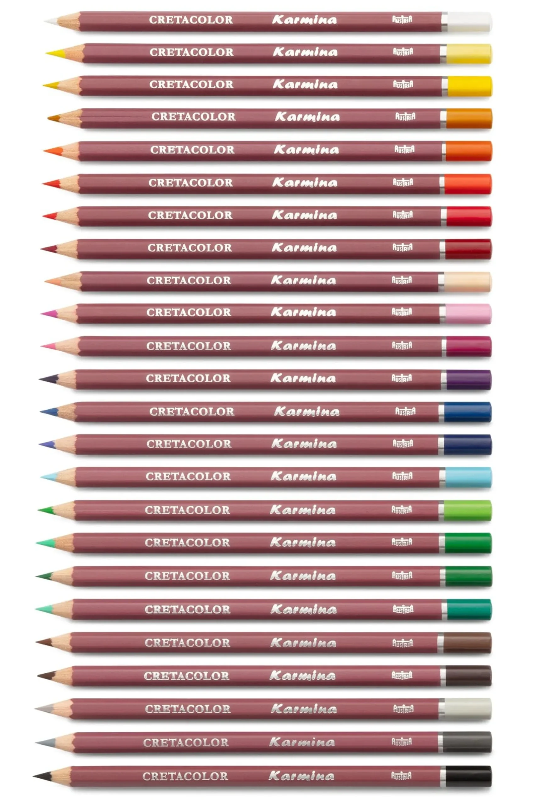 24 Stifte: je ein Permanentweiß, Neapelgelb, Cadmium Citron, Orange, Permanentrot hell, Permanentrot dunkel, Krappkarmin, Fleischfarben hell, Zyklam, Magenta, Violett, Ultramarin, Preußisch Blau, Lichtblau, Moosgrün hell, Moosgrün dunkel, Grasgrün, Smaragd, Ocker hell, Kastanienbraun, Umbra, Hellgrau, Dunkelgrau, Elfenbeinschwarz.