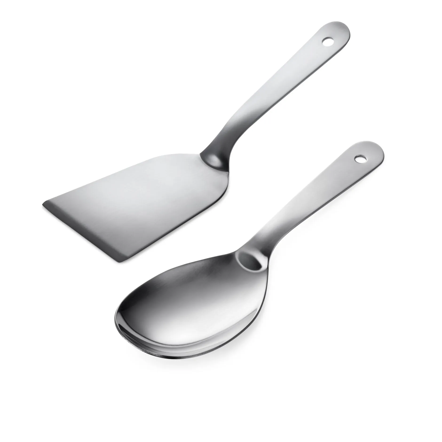 Für Norditalien typisch sind in der Metallverarbeitung nicht nur die Großen der Branche in Mailand oder Turin, sondern vor allem viele mittelständische und Familienunternehmen, die aber ebenso auf die italienische Art der Verbindung von Form und Funktion bedacht sind, wie man sie im Großen findet. So zeigt sich dieses Prinzip auch bei diesen solide und ausgewogen in der Hand liegenden Servier- und Küchenhelfern aus Edelstahl, die im Piemont in Omegna am Ortasee gefertigt werden. Beide lassen sich vielseitig einsetzen und zudem an ihrem Griff aufhängen.