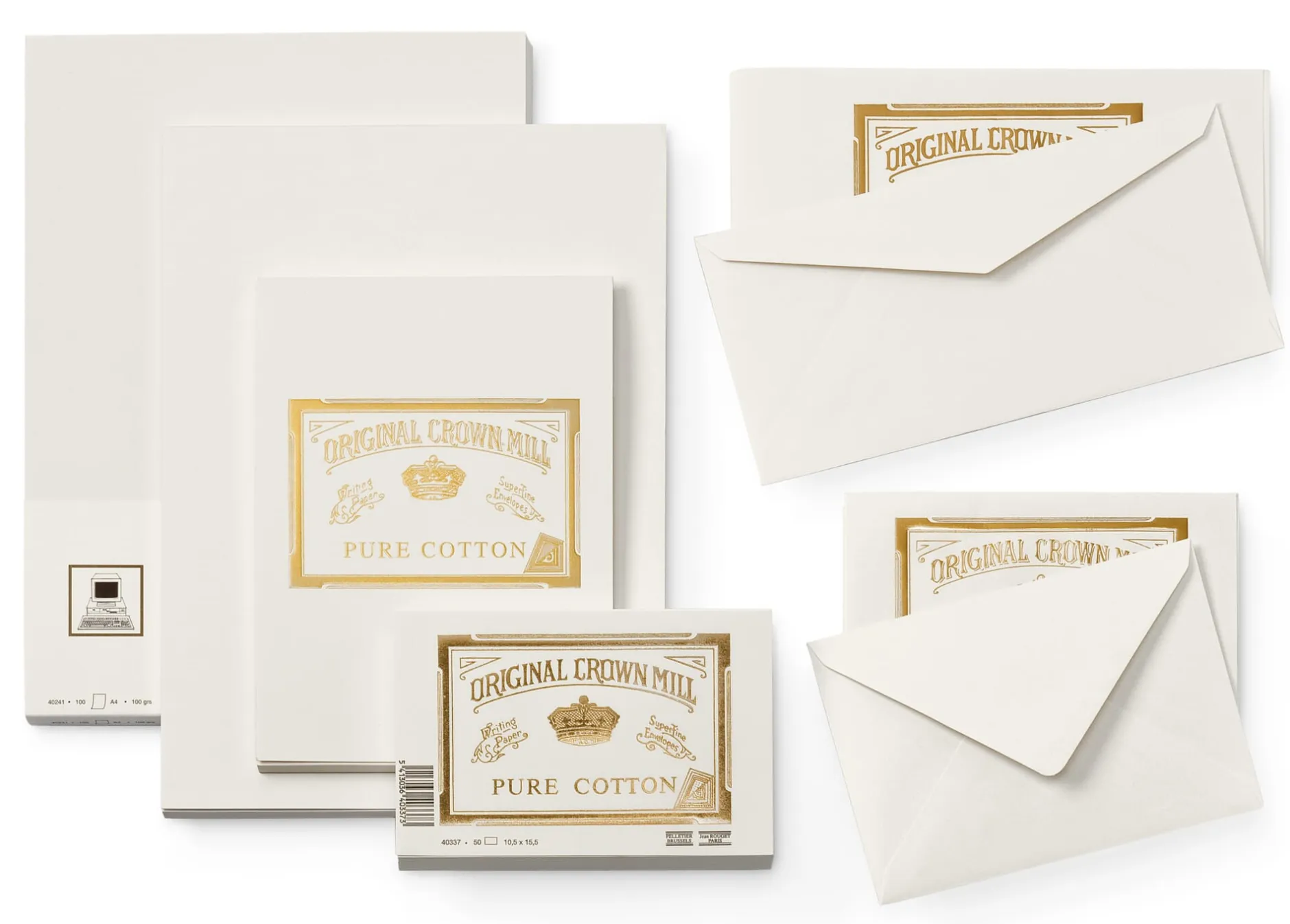 Neben dem Briefpapier (100 g/qm) – in A4 als Briefblock oder Einzelbogen mit Wasserzeichen „Original Crown Mill“ oder in A5 als Briefblock ohne Wasserzeichen erhältlich – bieten wir jeweils die passenden Briefkarten (280 bzw. 300 g/qm) mit einer festeren Struktur sowie gefütterte Kuverts in zwei Formaten an.