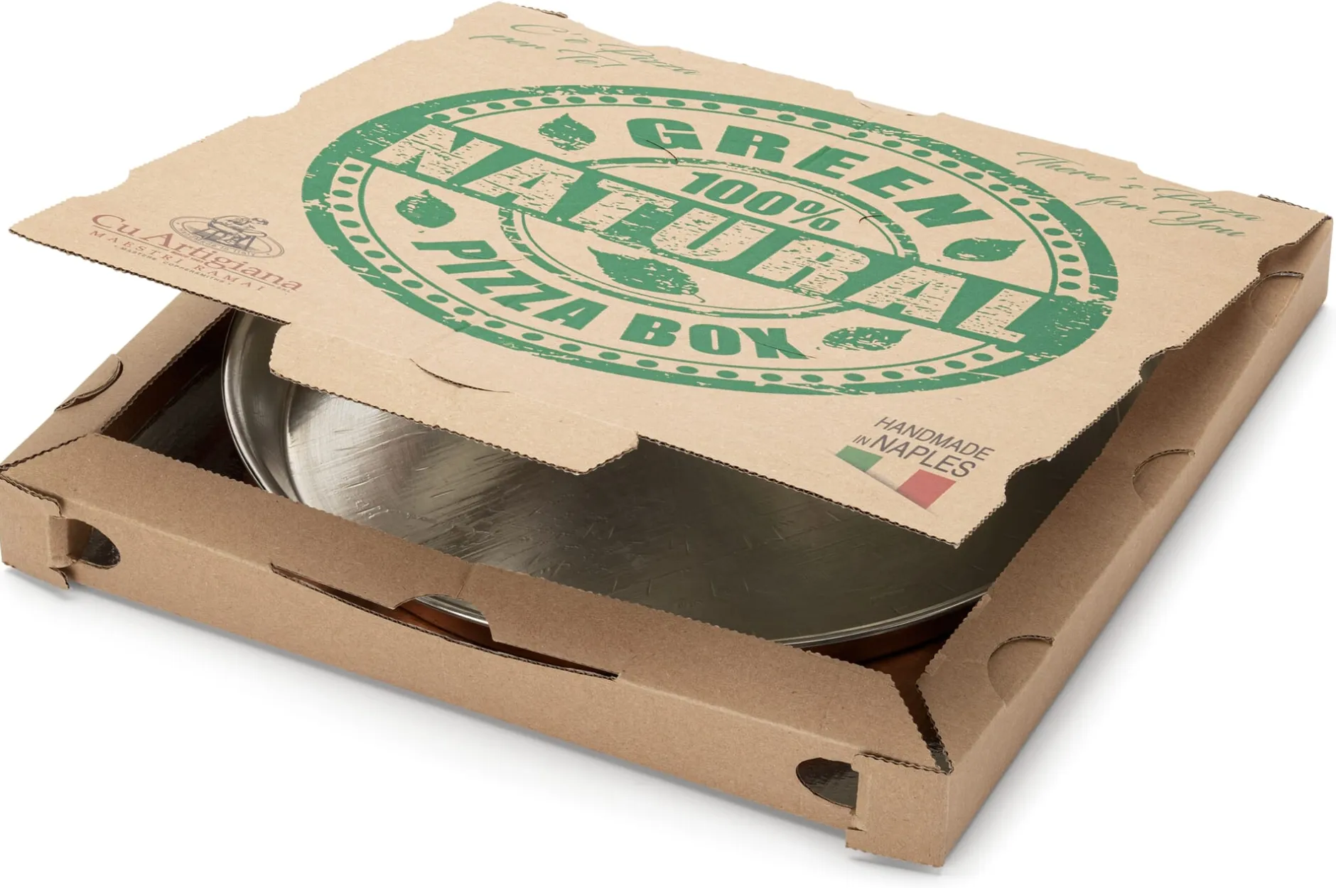Kupfer, an der Innenseite verzinnt. Boden Ø 28 cm, Ø oben 31 cm. Randhöhe 2,5 cm. Gewicht 680 g. Lieferung in einer Pizzaschachtel aus bedrucktem Karton.