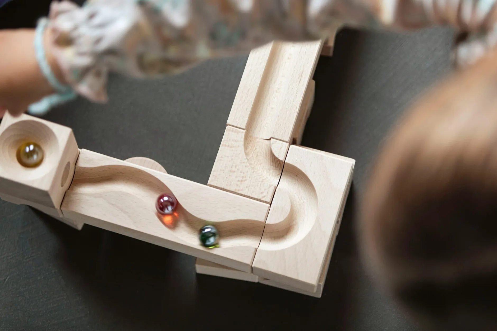 Die Glasmurmel kullert durch lange Rinnen, saust durch enge Kurven, verschwindet in einem Tunnel, rollt verdeckt weiter und fällt an völlig anderer Stelle aus ihrem Schlupfloch. Eine gelungene Kombination der Elemente ergibt Bahnen, die sowohl auf der Oberfläche der Elemente als durch deren Tunnelbohrungen hindurch verlaufen. Die Kombinationsmöglichkeiten tendieren gen unendlich – das Wie und Wohin der Kugeln hängt also ganz von den kleinen und großen Baumeister*innen ab, die auch mit einfachen Konstruktionen immer neue Murmelbahn-Labyrinthe erfinden können.