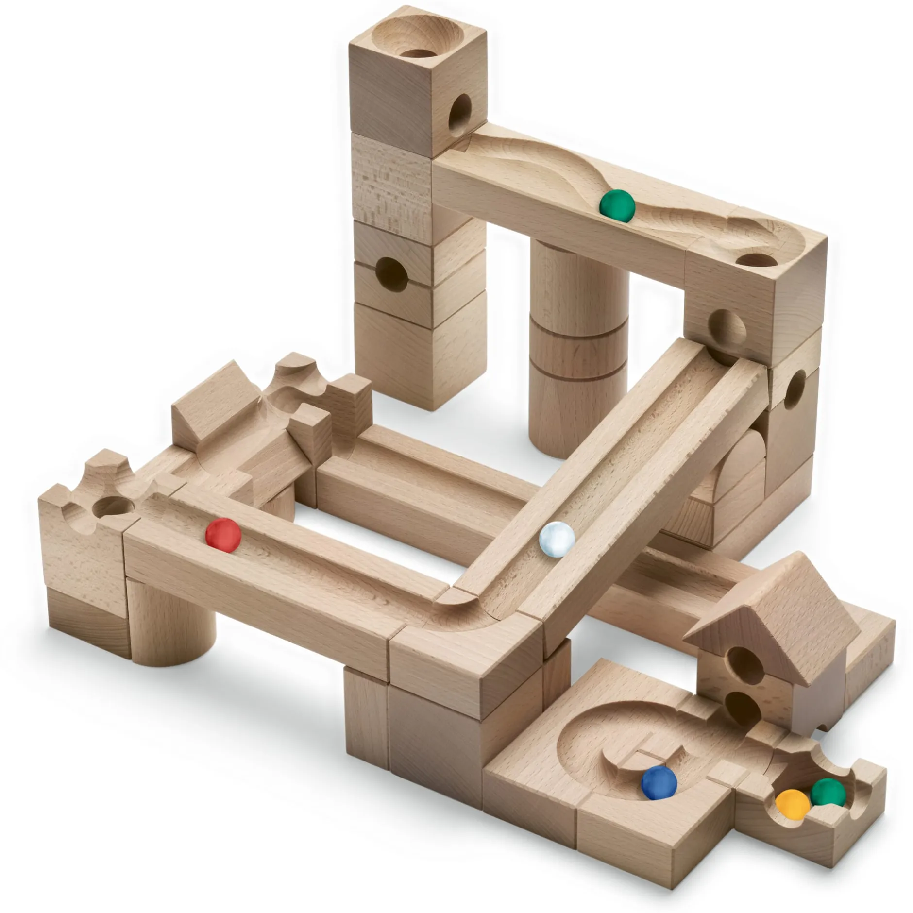 Ab 3 Jahre. Buchenholz (Herkunft Schweiz) naturbelassen. 40 Holzelemente in verschiedenen Formen und Größen (2,5–6,5 cm) und 6 farbige Glasmurmeln. Hergestellt in der Schweiz. Gewicht 3 kg.