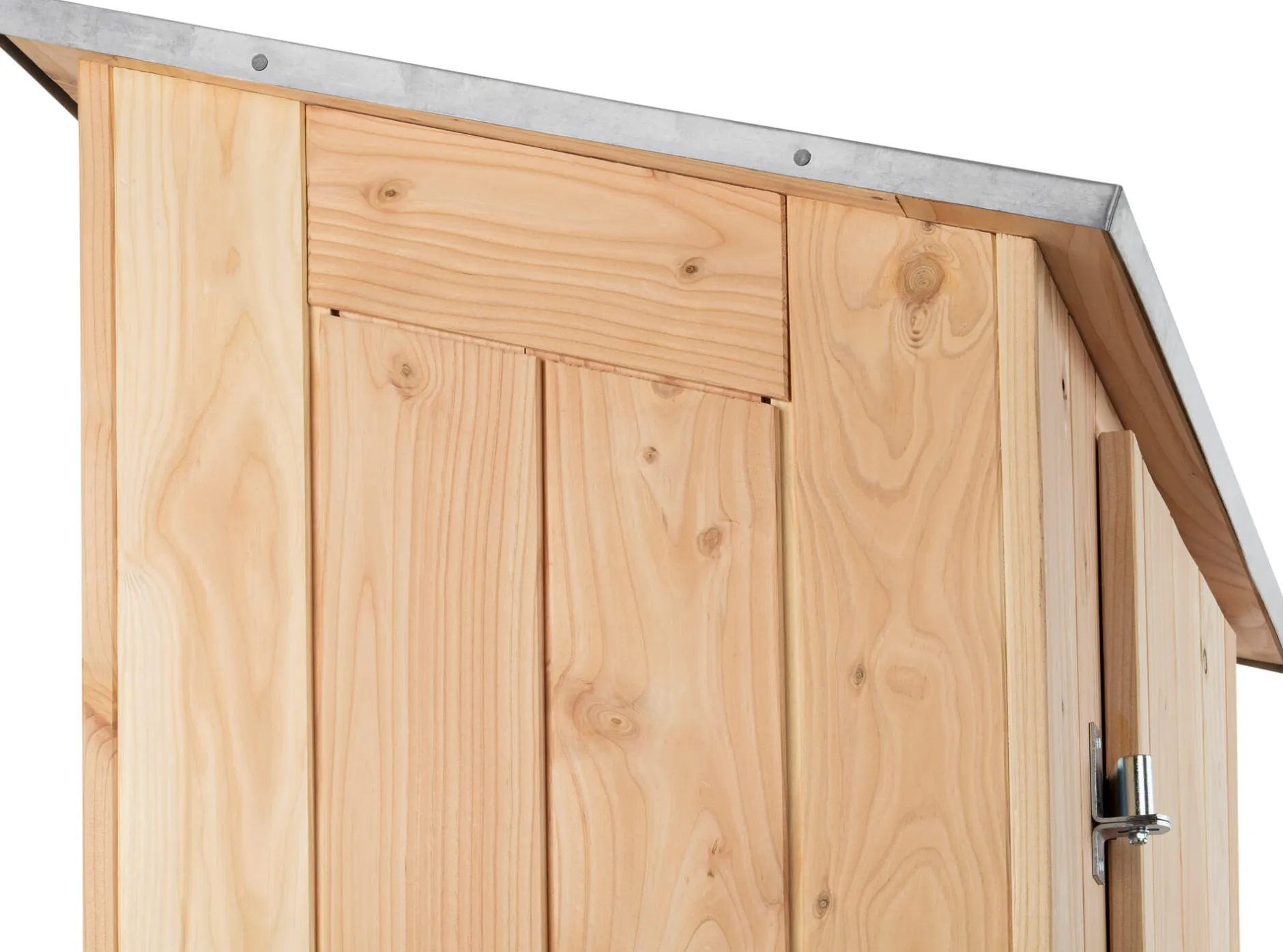 Unbehandeltes Douglasienholz (Herkunft Frankreich, Belgien) in natürlicher Astigkeit. Dach aus Zinkblech, Beschläge und Haken aus galvanisiertem Stahl. Kunststoffgleiter. Gefertigt in Deutschland. Türöffnung 160,5 × 44,5 cm. Außenmaße inkl. Dach Höhe 2 m, Breite 95 cm, Tiefe 62 cm. Gewicht 90 kg.