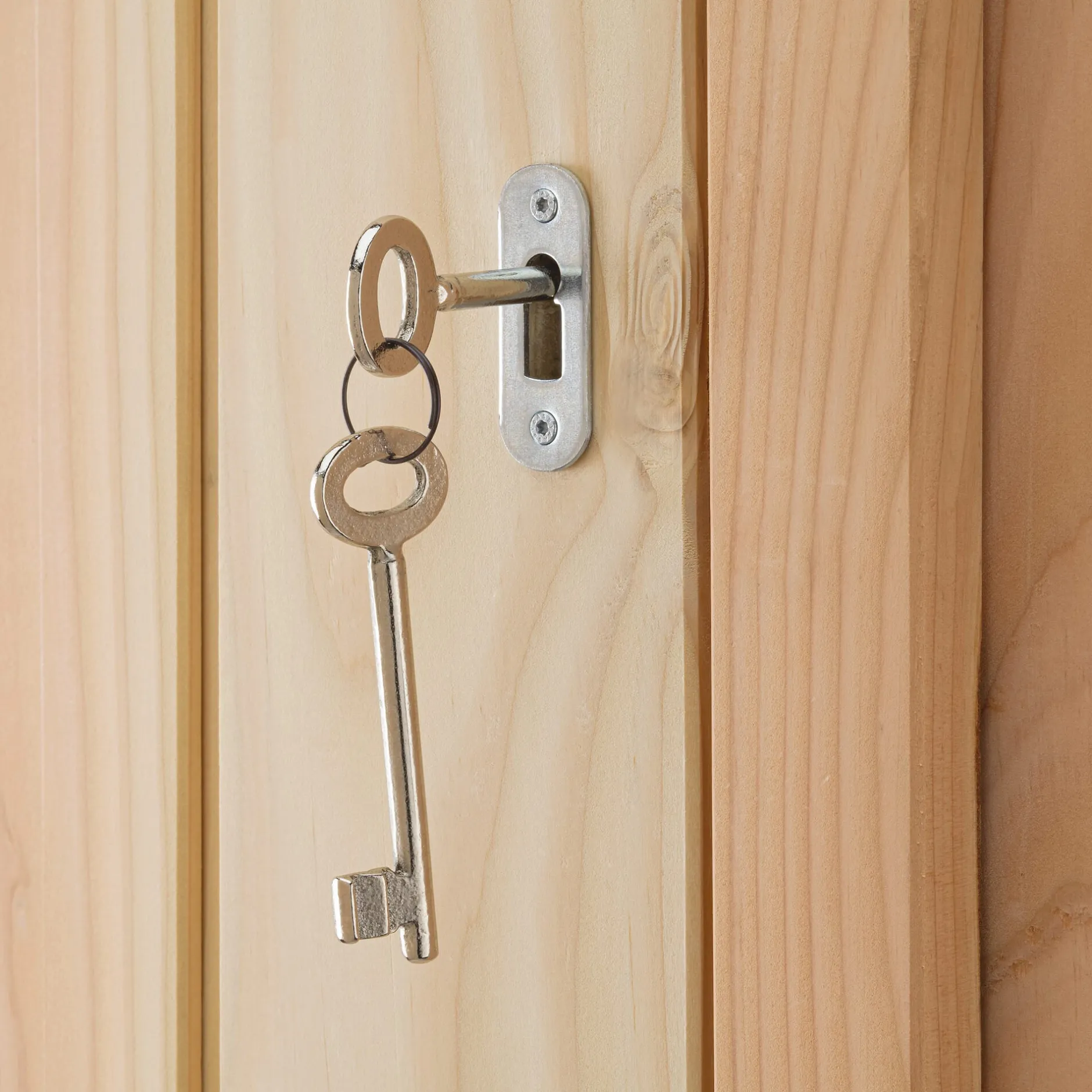 Zur Innenausstattung gehören 5 Regalböden (46,5 × 19 × 2 cm, montiert mit einem Abstand von je 31 cm), 3 Türhaken und 2 an der Rückwand montierte Doppelhaken. Lieferung mit 2 Schlüsseln.