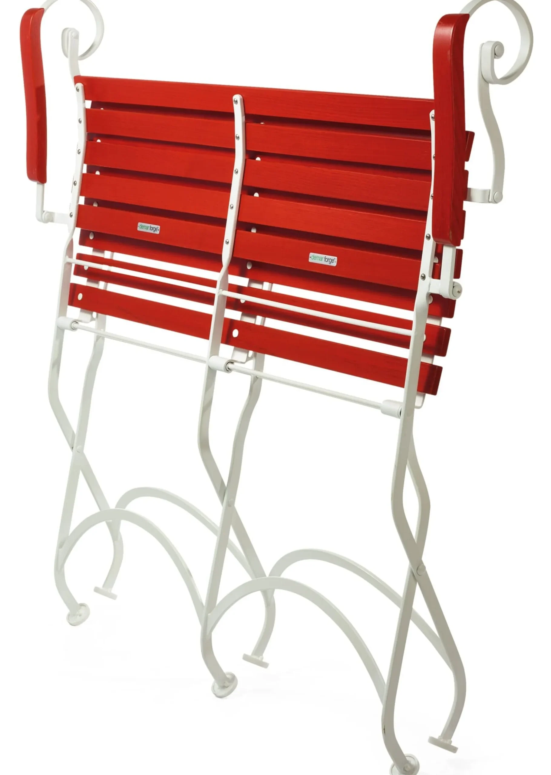 Die Möbel von Demar Forge fallen auf – nicht nur durch die Farbkombination aus Signalrot und leuchtendem Weiß. Bank und Tisch sind ausladende Gartenmöbel, stabil gebaut aus belastbaren Bandstahl-Gestellen, die zur Verlängerung der Lebensdauer unter der Lackschicht eine Verzinkung tragen, und Auflagen aus Kastanienholz, das an sich zu den haltbarsten europäischen Hölzern zählt und hier zusätzlich lackiert ist.