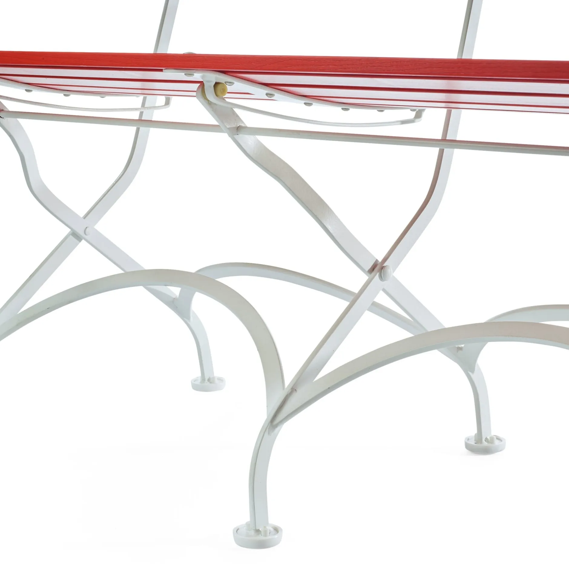 Klassisch an dieser Gartenbank ist neben der geschwungenen Form der Sitz- und Anlehnfläche, auf der es sich auch ohne Polster oder Unterlage bequem sitzen lässt, auch die Farbkombination aus leuchtendem Rot und hellem Weiß. Recht ungewöhnlich für ein Gartenmöbel diesen Ausmaßes ist, dass es sich so schmal zusammenklappen lässt.