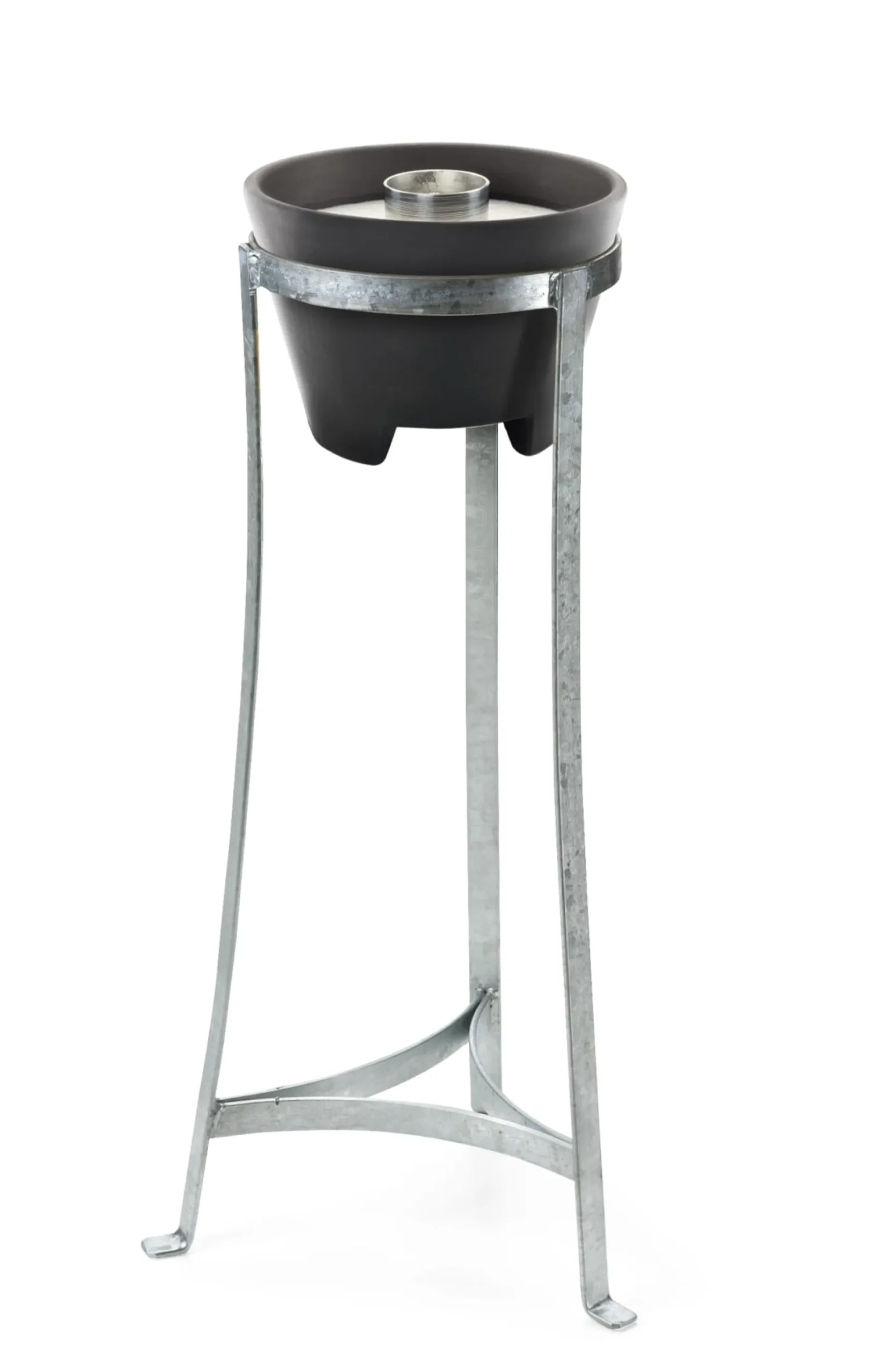 Bestehend aus einem Schmelzfeuer – wahlweise Lavaschwarz oder Natur – und einem Blumentopfständer aus feuerverzinktem Stahl, der witterungsbeständig und nebenbei auch als solcher zu benutzen ist (tagsüber). Maße des Ständers: Höhe 60 cm, Standfläche Ø 34 cm. Gewicht 2 kg.