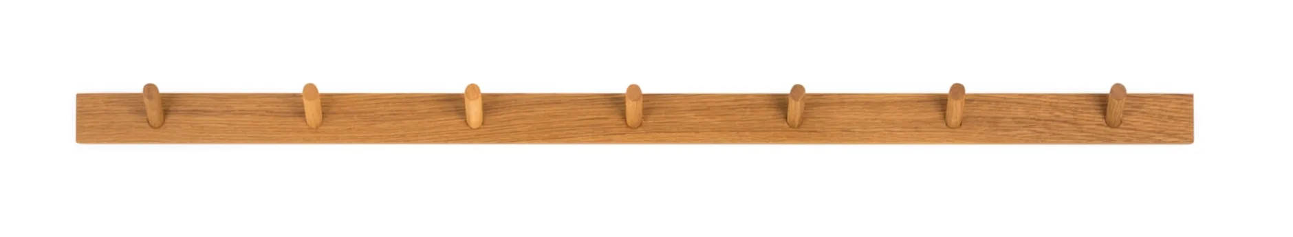 Die Garderobenleisten dieser Garderobenserie aus geöltem Eichenholz sind miteinander kombinierbar: Bündig montiert, bleibt ihre Symmetrie erhalten – denn die Zwischenräume zwischen den Haken sind doppelt so groß wie der Abstand von der Außenkante zum Haken.