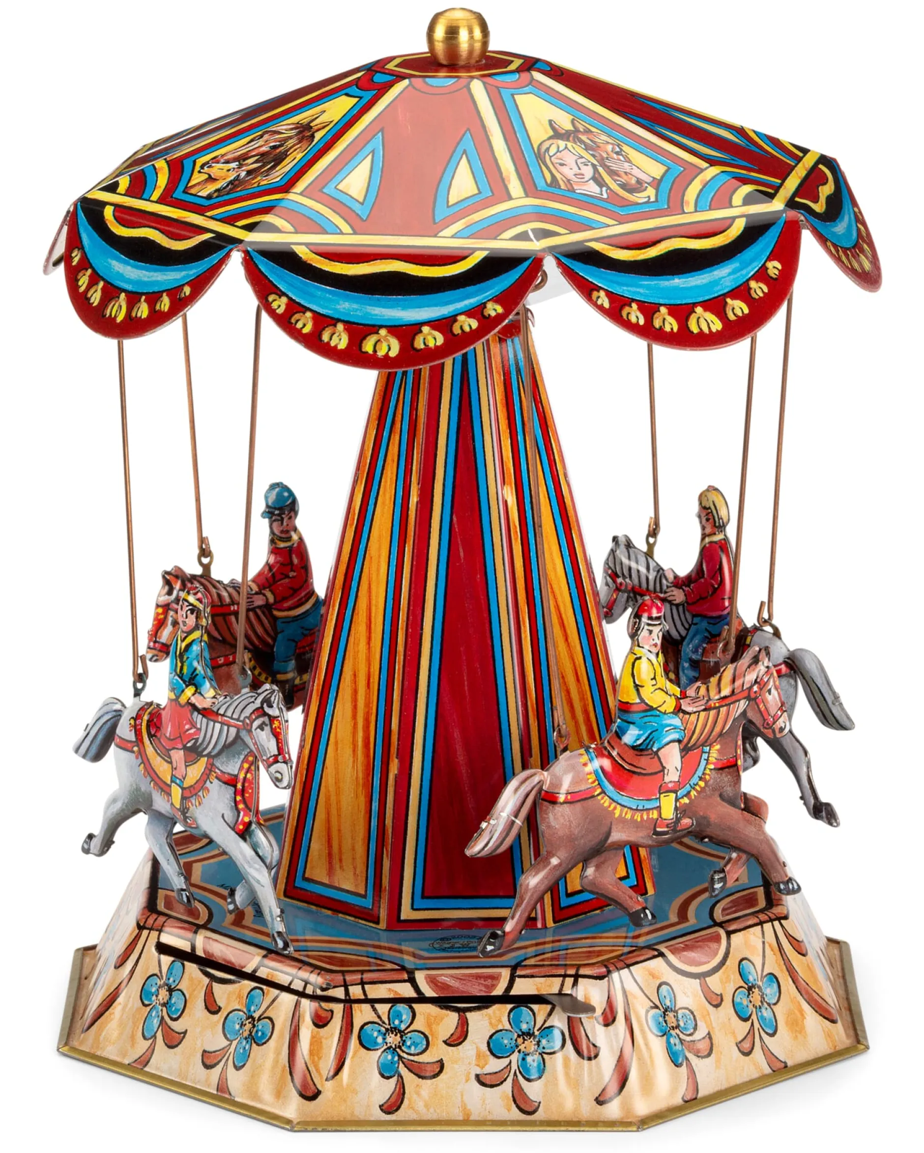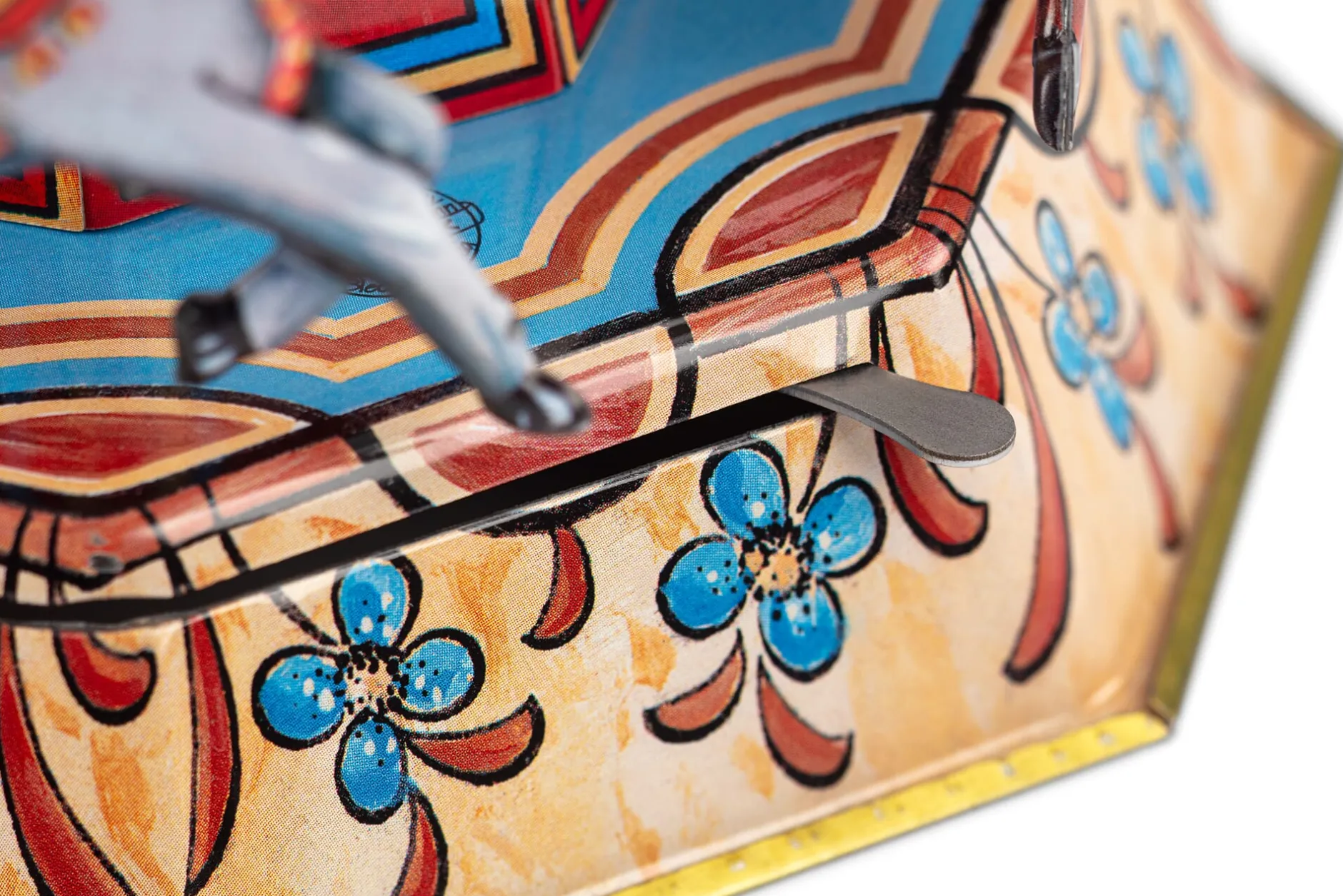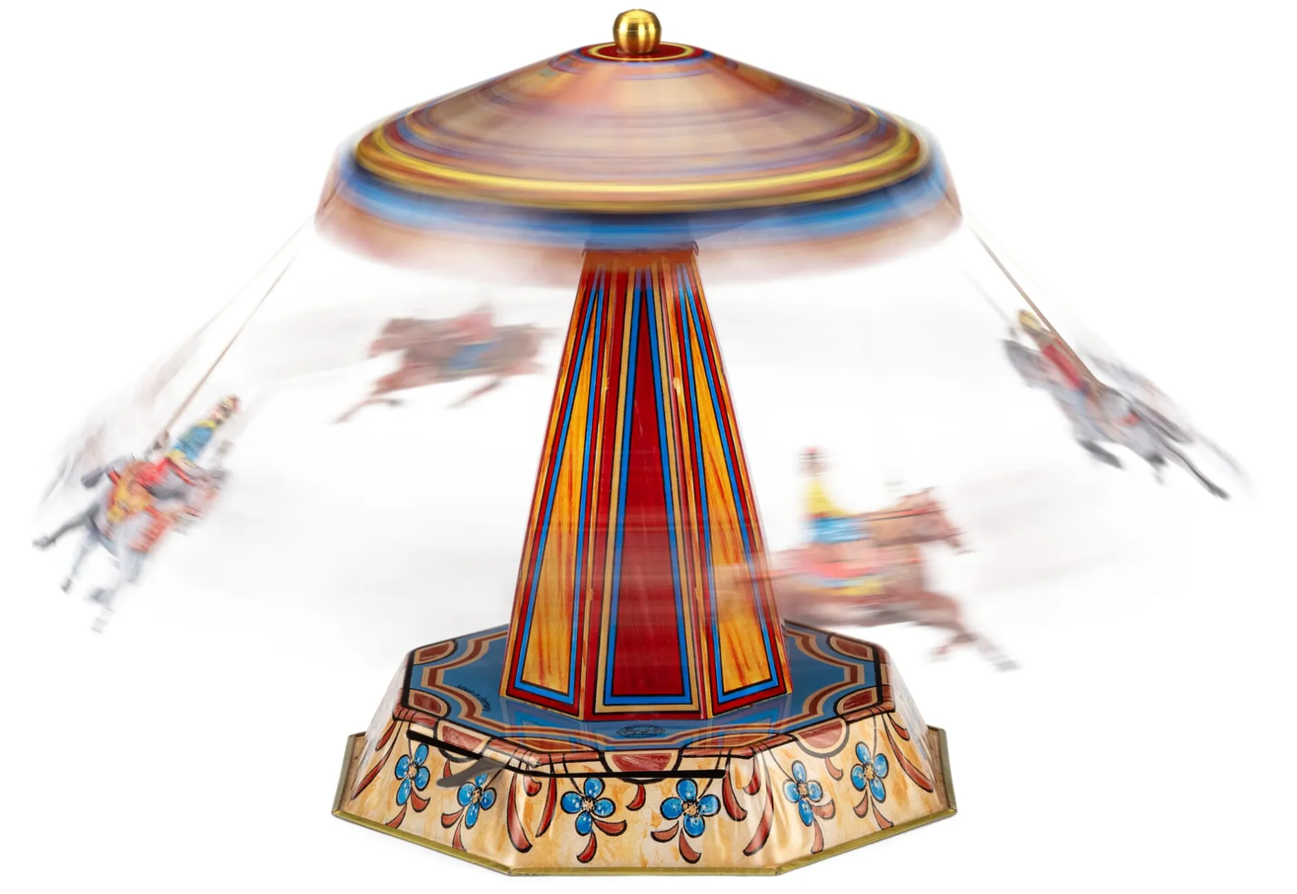 Gut festhalten, denn vier jugendliche Reiter*innen traben an, sausen im Rund und heben dabei ab wie im klassischen Kettenkarussell – überzeugt Weißblech bereits mit Solidität, so zeigt es hier zusätzlich Schwung. Für den flüssigen Bewegungsablauf sorgt ein robustes Hebel-Federwerk aus Werkzeugstahl – eine kluge Konstruktion, die den Schlüssel obsolet macht (zumal Schlüssel gerade bei Sammlerstücken mehr für ihre Unauffindbarkeit als für ihre Funktionalität berühmt sind). Der Hebel ist in den Sockel des Karussells integriert: Je weiter Sie ihn zur Seite verschieben, desto stärker ziehen Sie das Federwerk auf und umso schneller und länger dreht sich das Karussell. Farbenfroh und harmonisch sind die historisierenden Lithografien von Sockel, Ross und Reiter*innen mit Dach-Motiven jüngerer Zeit kombiniert – so ergibt sich in der Bewegung ein bunter Wirbelsturm und in Ruhephasen ein anziehender Blickfang in der Sammlervitrine.