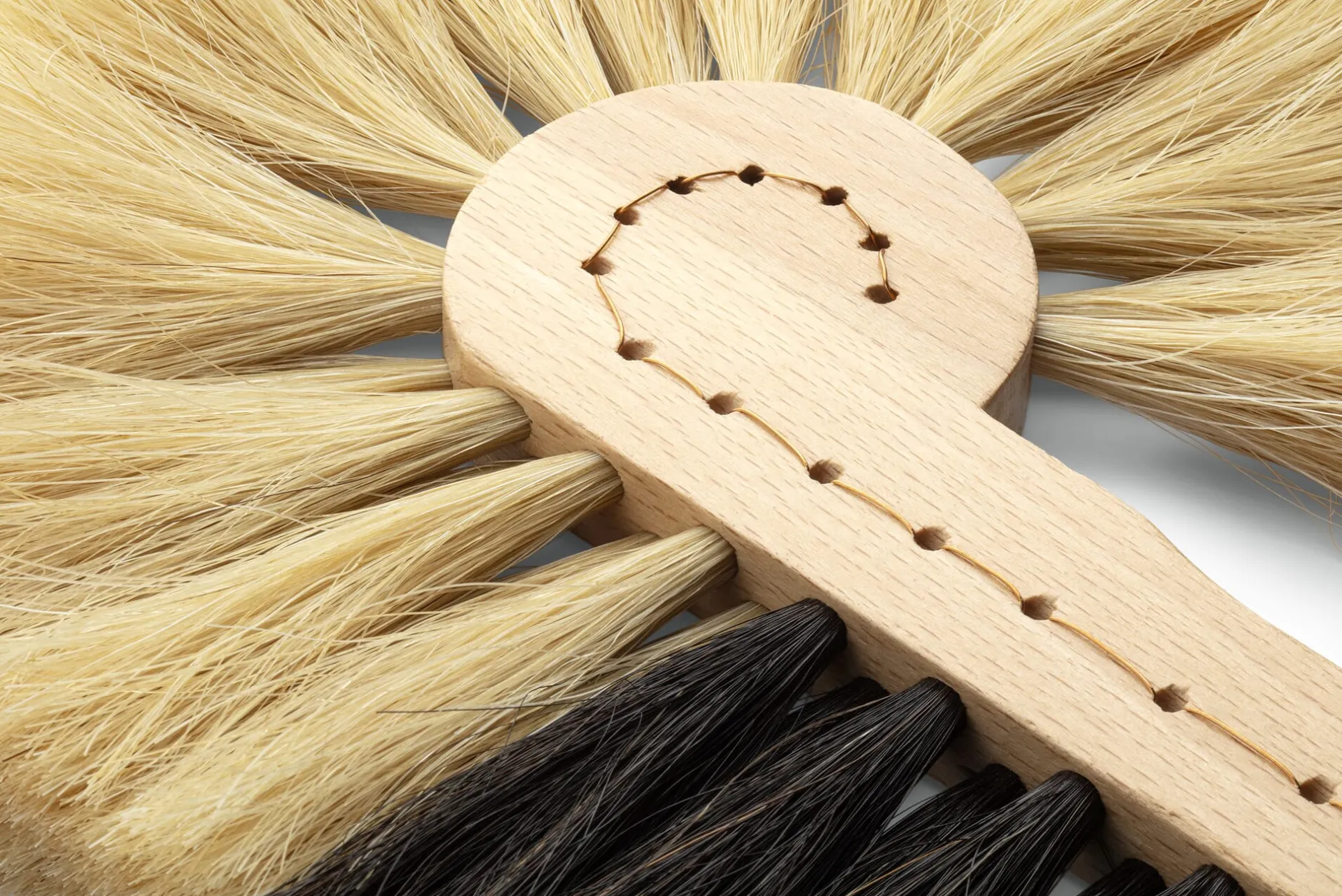 Ein Schrankbesen in der traditionellen Form, aber mit einer doppelt so starken Besteckung wie sonst üblich: Statt mit einer wird der Besen mit zwei Borstenreihen gefertigt. Die so entstehende feste, breite Bürste aus reinem Rossschweifhaar nimmt problemlos Staub und Spinnweben hinter Schränken, in schmalen Nischen oder von Wänden auf. Mit zweiteiligem Stiel für eine große Reichweite.