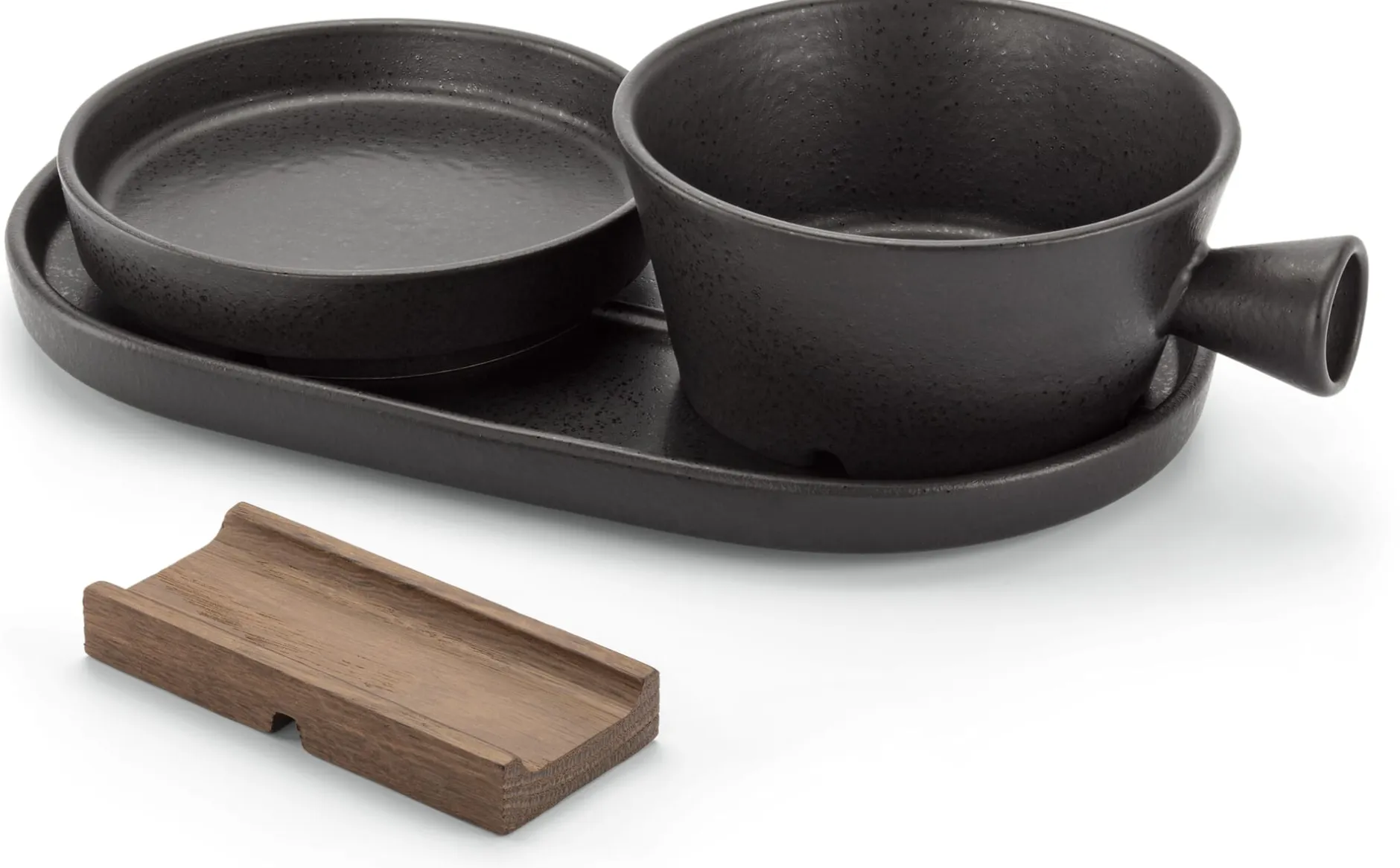 Seifenschale, Deckel und Tablar aus gebranntem Steinzeug. Mit einer Holzablage aus Räuchereiche (Herkunft Spanien). Seifenschale Ø 12 × B 15 × H 6 cm. Deckel Ø 12,5 × H 3 cm. Tablar L 14,5 × B 25 × H 2 cm. Gesamtgewicht 1.600 g. Hergestellt in Portugal.