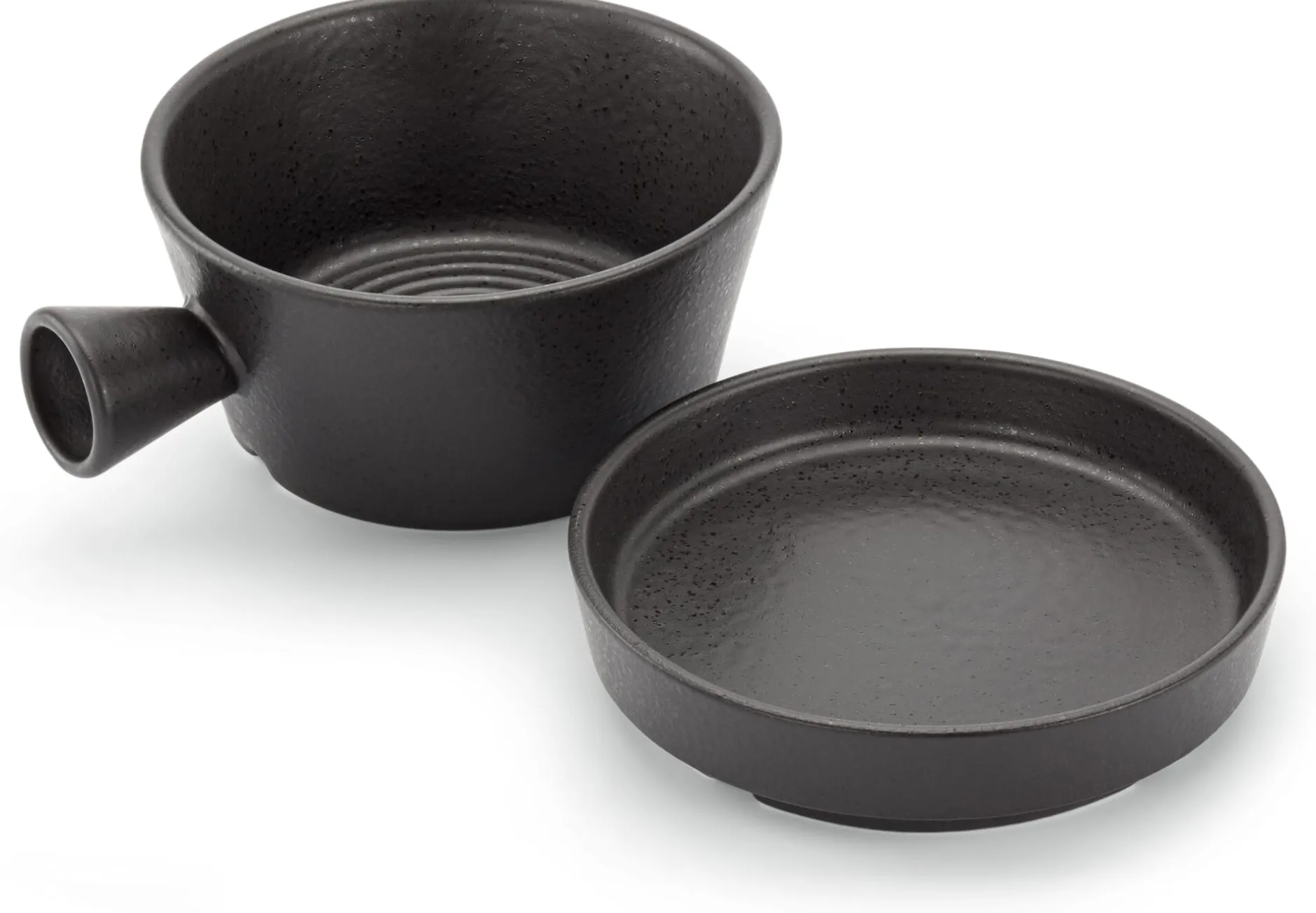 Dieses Rasurset als Skulptur zu bezeichnen wäre sicherlich übertrieben, wenn auch Fertigung, Maße und Design das Ensemble durchaus in die Nähe von Objekten mit ästhetischem Anspruch rücken. In einer Werkstatt an der Westküste Portugals werden alle Teile von Hand gefertigt: Seifenschale, Deckel und Tablar aus mattschwarz lasierter Keramik, die Ablage ist sauber aus dem Holz der Raucheiche gefräst und feingeschliffen. Dank der akkuraten Verarbeitung passen alle Teile exakt ineinander, stehen sicher und verrutschen nicht so leicht.