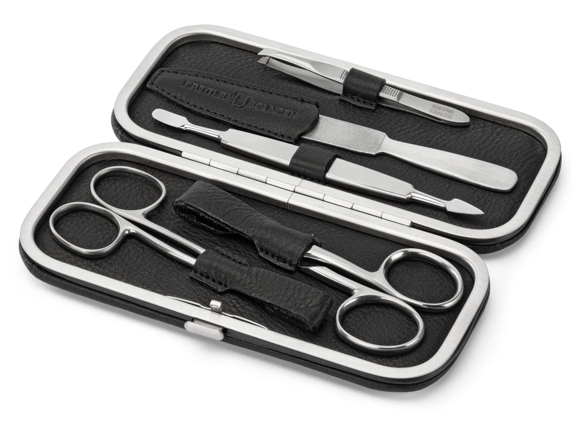 Bestückt mit je einer Haut- und Nagelschere, einer Pinzette (Länge 9 cm), einer Saphirfeile mit einer feinen und gröberen Seite, einem Doppelinstrument mit Nagelhautdrücker und Nagelreiniger. Alle Instrumente sind aus rostfreiem Edelstahl.