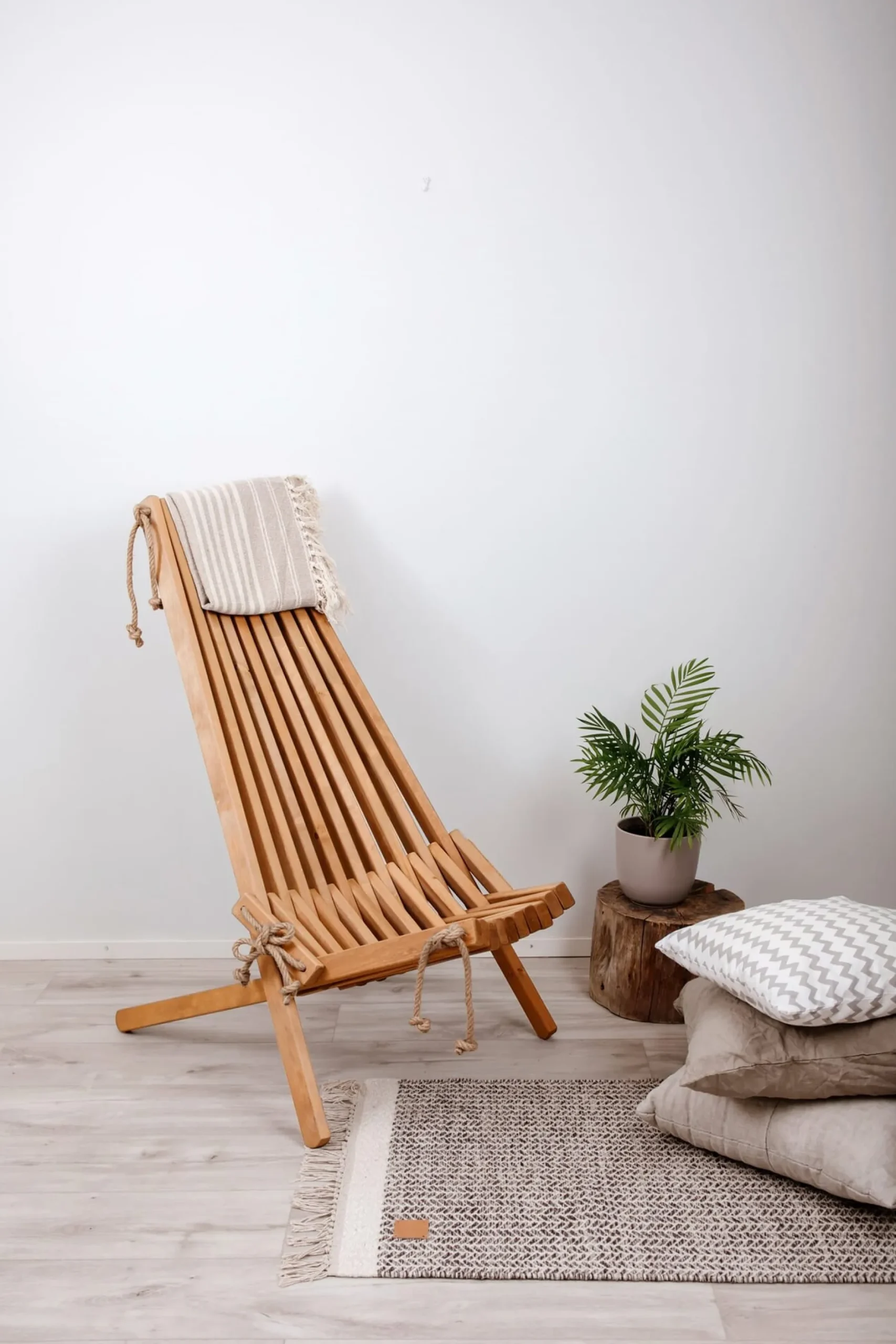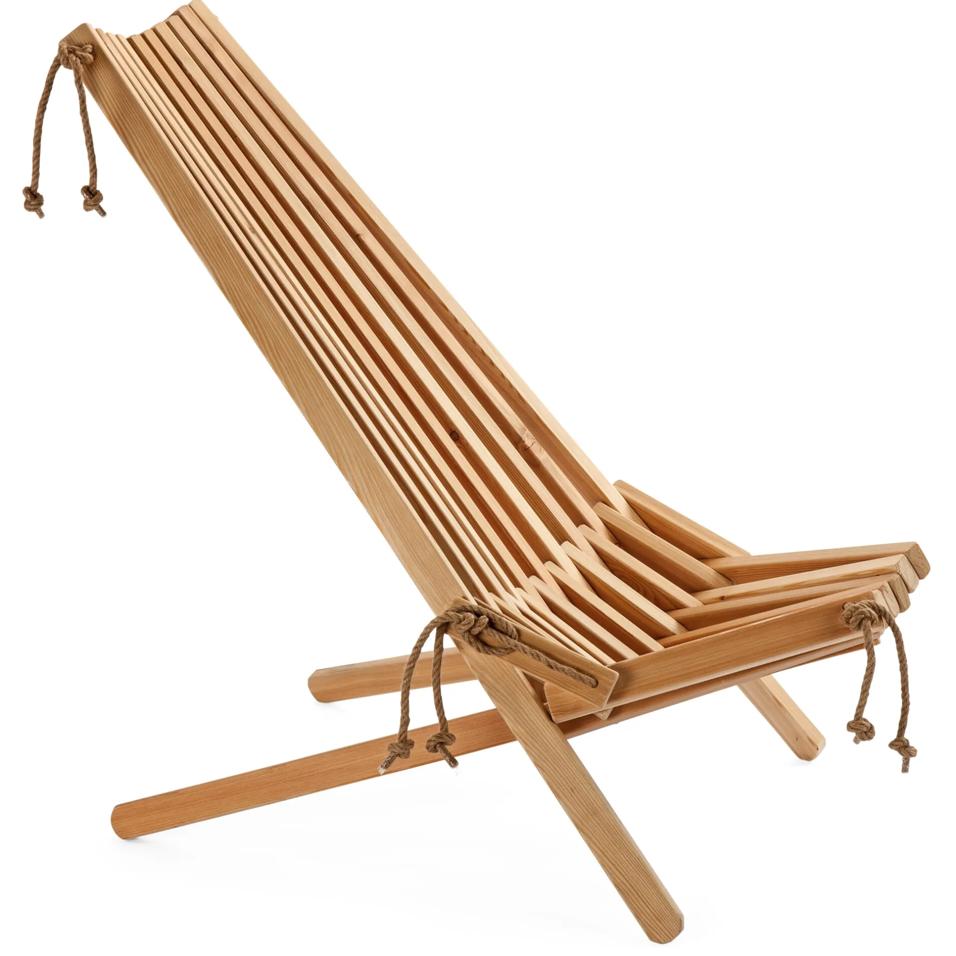 Zwei mögliche Sitzpositionen kennt dieser Sessel. Sie haben’s in der Hand, denn Sie bauen sich das Möbel selbst zusammen. Je nachdem, wie straff Sie die Halt gebenden Seile aus Hanf spannen, sitzen Sie eher aufrecht – oder aber bequem zurückgelehnt. Und ob nun windschiefer Altbau-Parkettboden drinnen oder unebener Untergrund auf der Wiese draußen, die Seilkonstruktion ist in jeder Situation von Vorteil, da sie den Ausgleich ermöglicht. So kann der Sessel kaum ins Kippeln geraten, ganz egal, wo Sie ihn aufstellen. Auch das für die Leisten verwendete Holz ist durchaus außentauglich. Erlenholz beweist seine Dauerhaftigkeit üblicherweise in Unterwasser-Holzkonstruktionen, traditionell werden etwa Stützpfähle daraus gemacht. Für unseren Faltsessel lassen wir das Holz eigens mit einem Pflegeöl vorbehandeln. Diesen pflegenden „Anstrich“ sollten Sie in regelmäßigen Abständen erneuern und das Holz säubern, um seine Haltbarkeit zu verlängern und es auch optisch aufzufrischen. Unser Hersteller in Estland bezieht es einem Betrieb in der Nachbarschaft.