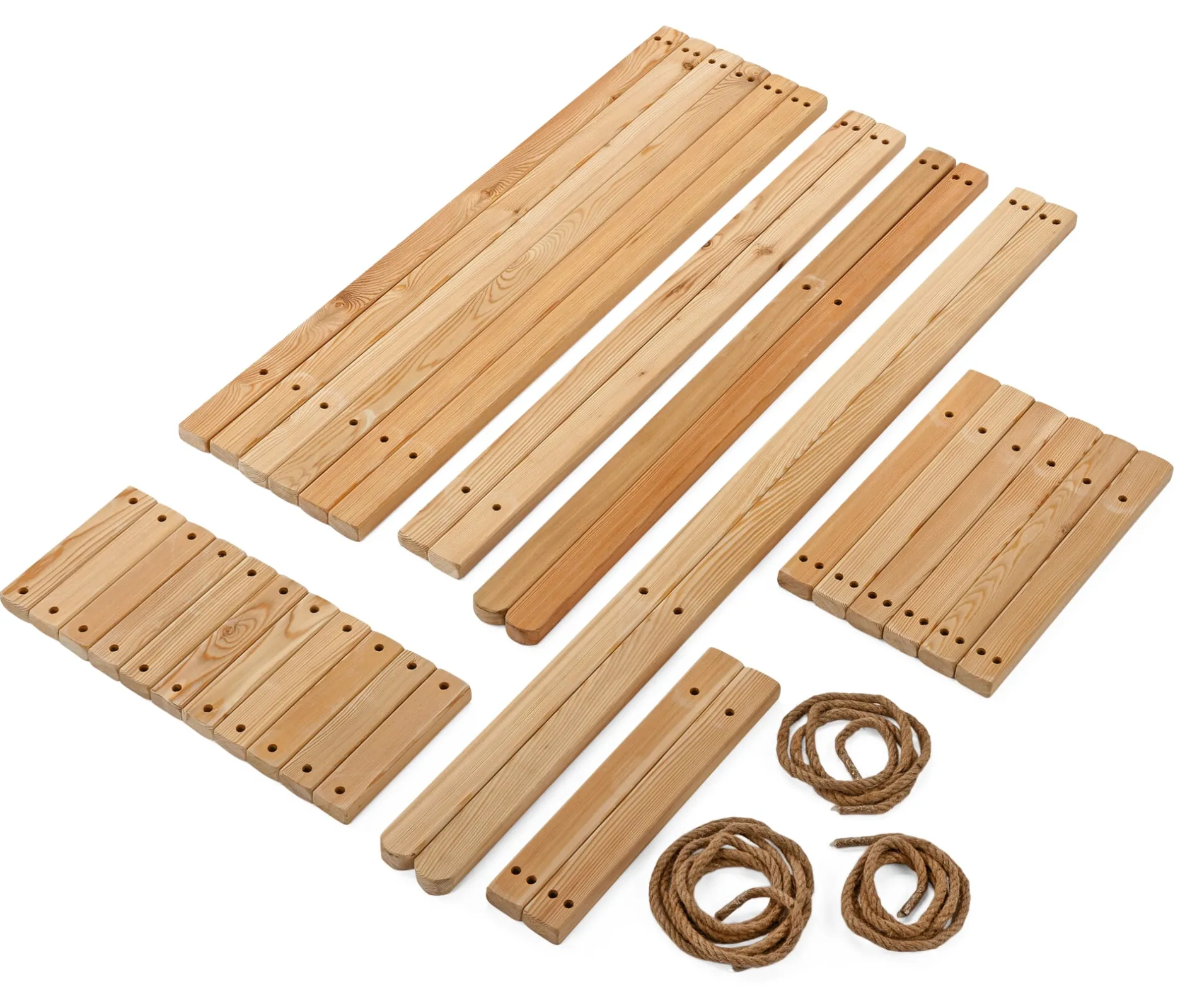 Erlenholz (Herkunft Estland) geölt. Seile aus Hanf. Hergestellt in Estland. Sitzhöhe vorne 38 cm, Sitztiefe 46 cm. Höhe 98 cm, Breite 54 cm, Tiefe 100 cm. Gewicht 12,2 kg. Belastungsgewicht max. 140 kg.