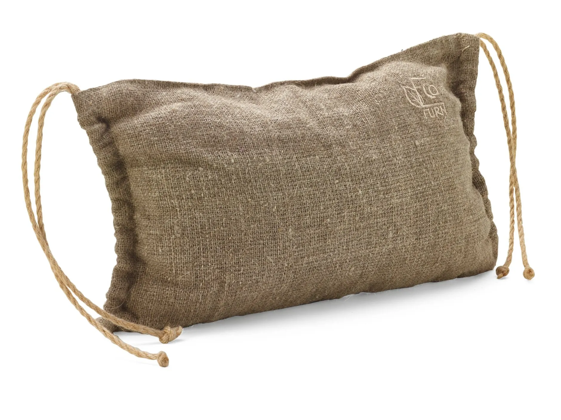 Ein einfaches Kopfkissen aus grobem Leinengewebe, das den Liegekomfort auf dem Faltsessel aus Lärchenholz erhöht. Die Kordeln dienen der Befestigung am Kopfteil.