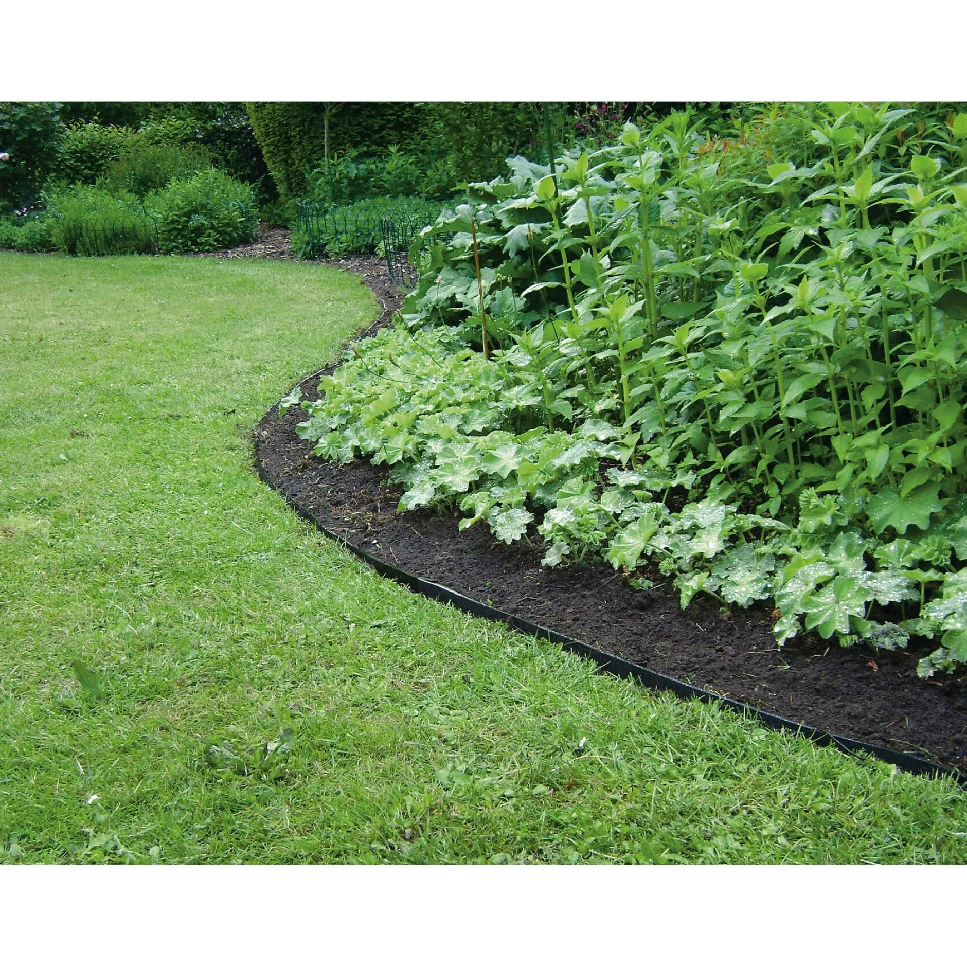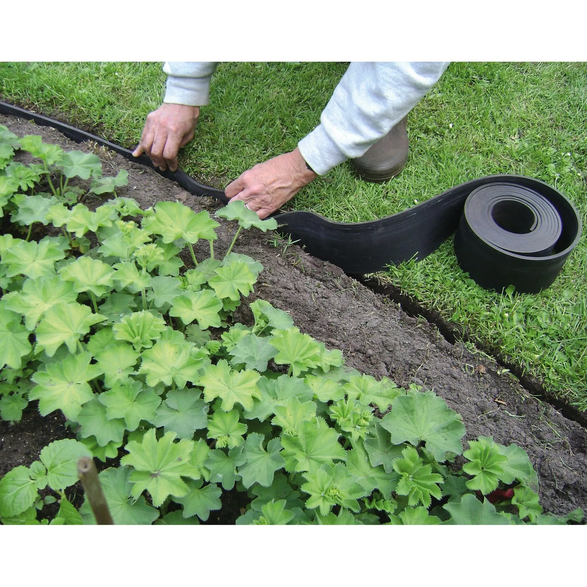 Zwischen Rasen- und Beetflächen in den Boden gegraben, trennt diese Rasenkante, hergestellt aus Gummi (recycelt), unterschiedliche Gartenbereiche wirkungsvoll voneinander. Zu diesem Zweck können Sie das 3 mm starke, elastische Band vor dem „Verlegen“ sogar zuschneiden – das geht ganz einfach mit einer entsprechend starken Schere. Das robuste Material der Rasenkante ist sehr langlebig und widerstandsfähig gegen Bewitterung und mechanische Belastung – ein unsanfter Tritt mit dem Arbeitsschuh oder das Überfahren mit der beladenen Schubkarre werden ihm nichts anhaben können. Beachten Sie bitte: Die Kante ist nicht geeignet für den Ausgleich von Höhenunterschieden zwischen verschiedenen Flächen.