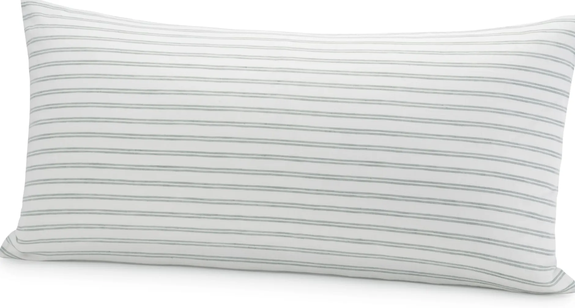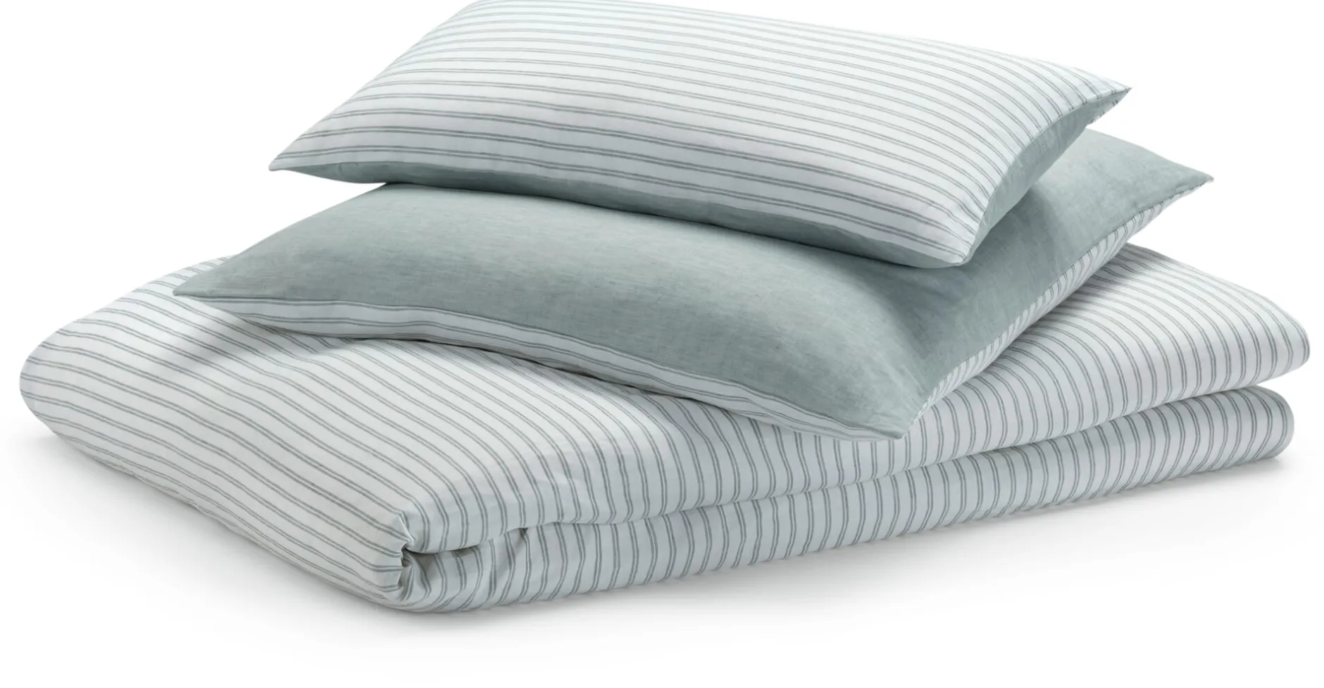 Für das leinwandbindige Gewebe wird in der Kette feines Baumwollgarn in Weiß und im Schuss grüngraues Leinengarn mit jeweils variierender Garnstärke verwendet. Dadurch erscheint die unifarbene Seite leicht meliert. Auf der anderen Seite verlaufen schmale Doppelstreifen in Grüngrau auf dem weißen Fond – daher haben Sie die Wahl: grüngrau changierender Farbakzent oder frisches Weiß mit lichten Streifen. Das Halbleinen ist trotz des feinen Gewebes strapazierbar, vorzugsweise sollte es jedoch nicht in den Trockner gegeben werden, da dies die Fasern aufgrund der hohen Hitze und der Reibung belastet. Zudem können Sie die Bettbezüge nach dem Trocknen an der Luft leichter wieder glattbügeln, dafür die Wäsche nicht ganz trocknen lassen. Alle Bezüge sind mit Reißverschlüssen versehen.