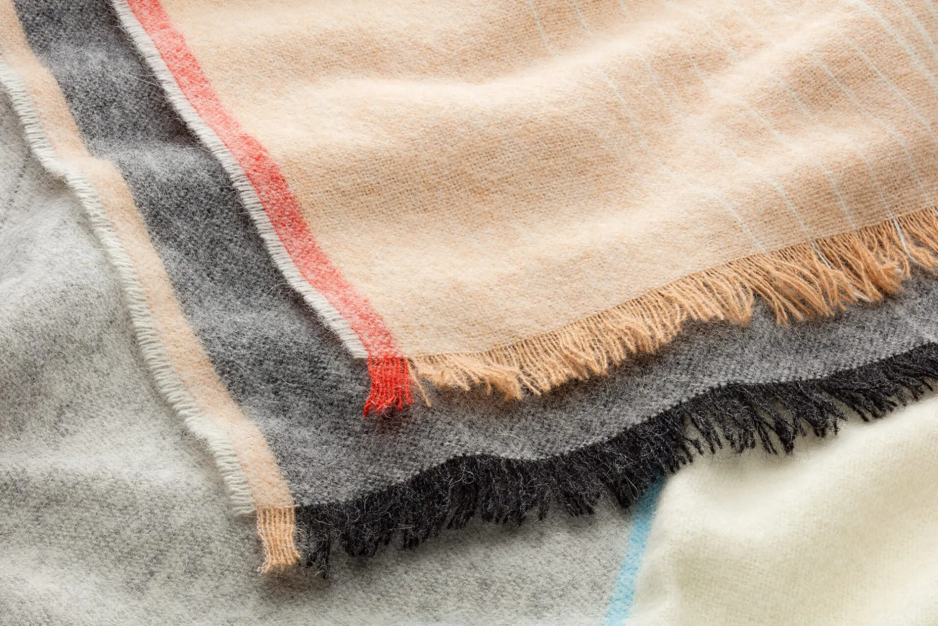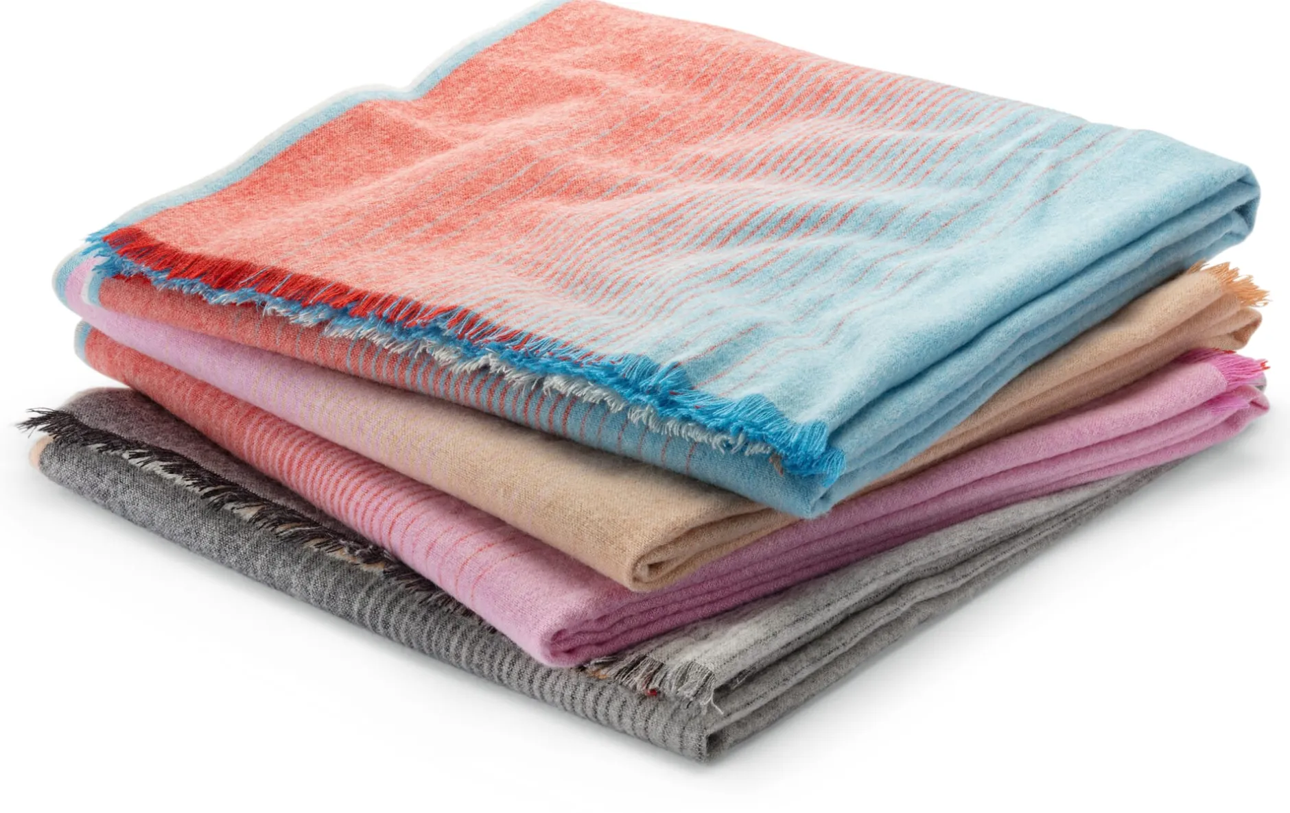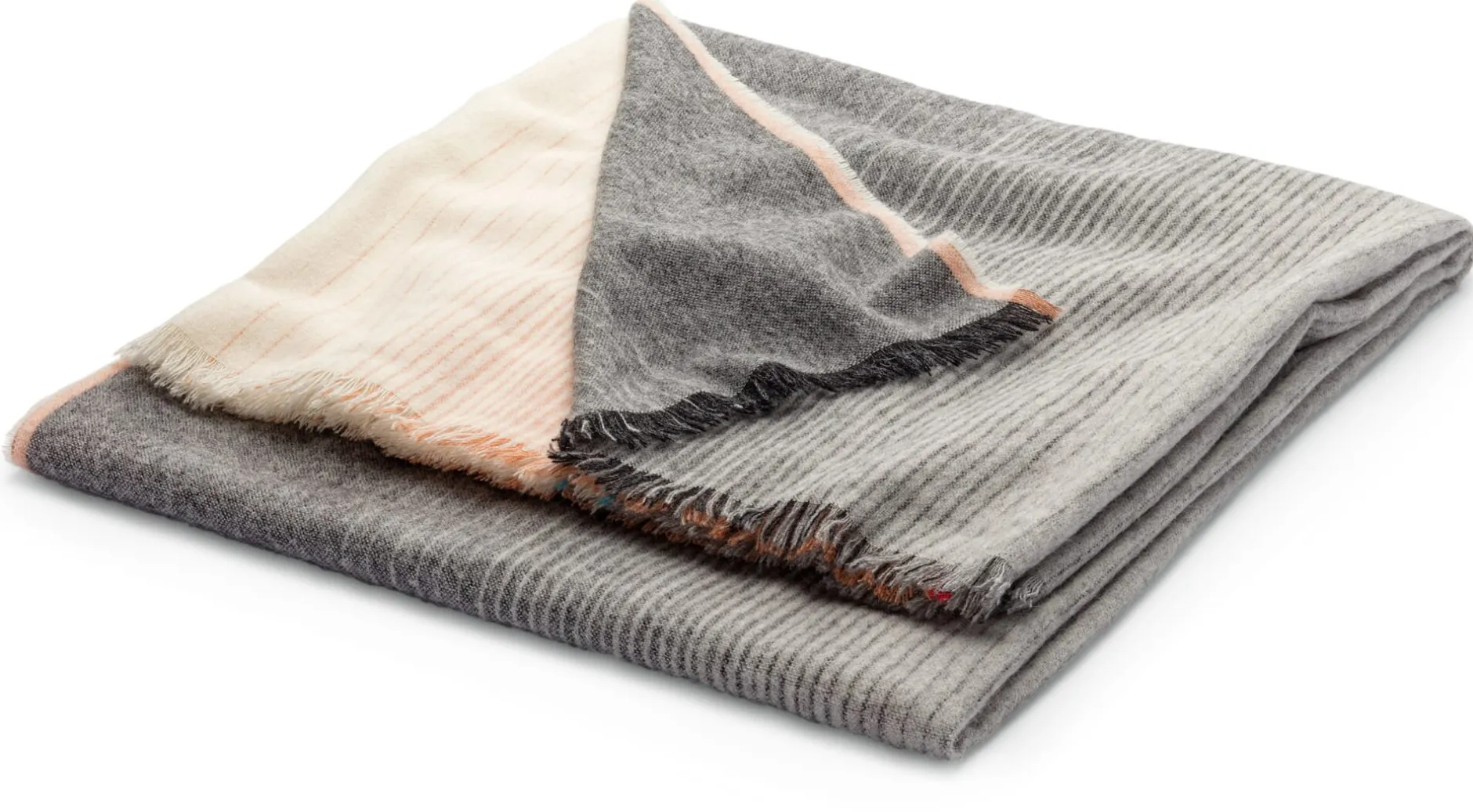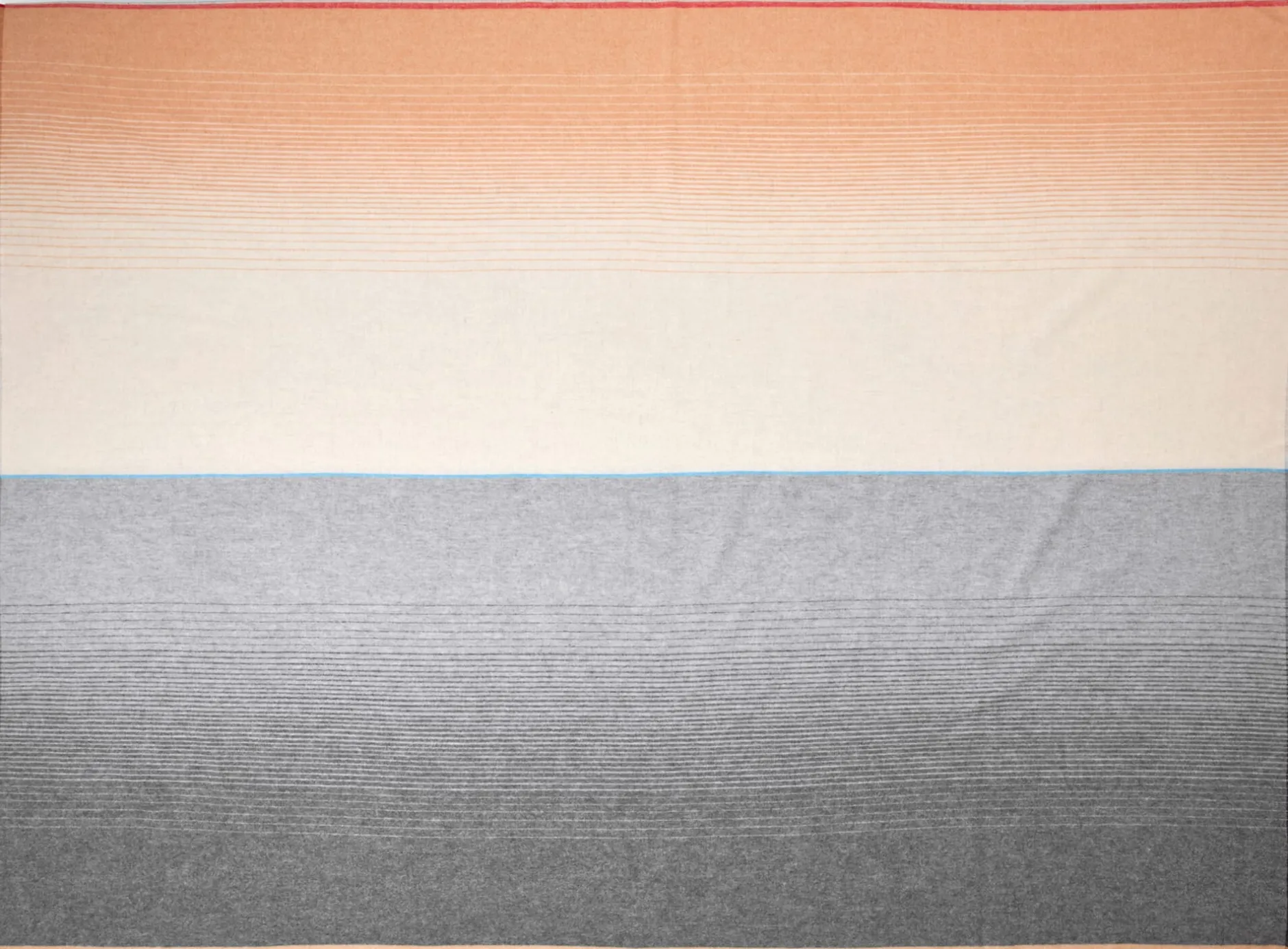 Schlicht und geradlinig ist das grafische Muster mit seinen kontrastierenden Farben, die bei dieser weichen Alpakadecke für Spannung sorgen. So sanft die gewebten Farbverläufe der beiden Farbflächen sind, so unmittelbar treffen sie in der Mitte der Decke aufeinander – wie Erde und Himmel am Horizont. Zwei Bilder, die den Horizont zeigen, waren es auch, die die französische Designerin Inga Sempé zu diesem Entwurf inspirierten. Die Farben wählte sie passend zu den abstrahierten Landschaftsmotiven aus: warme Rot-, Orange- und Grautöne für die Erde, Blau und Rosa für das Wasser. Sempé selbst nennt ihre Kollektion „Carte Postale“, weil die Motive sie an alte Urlaubspostkarten erinnern.