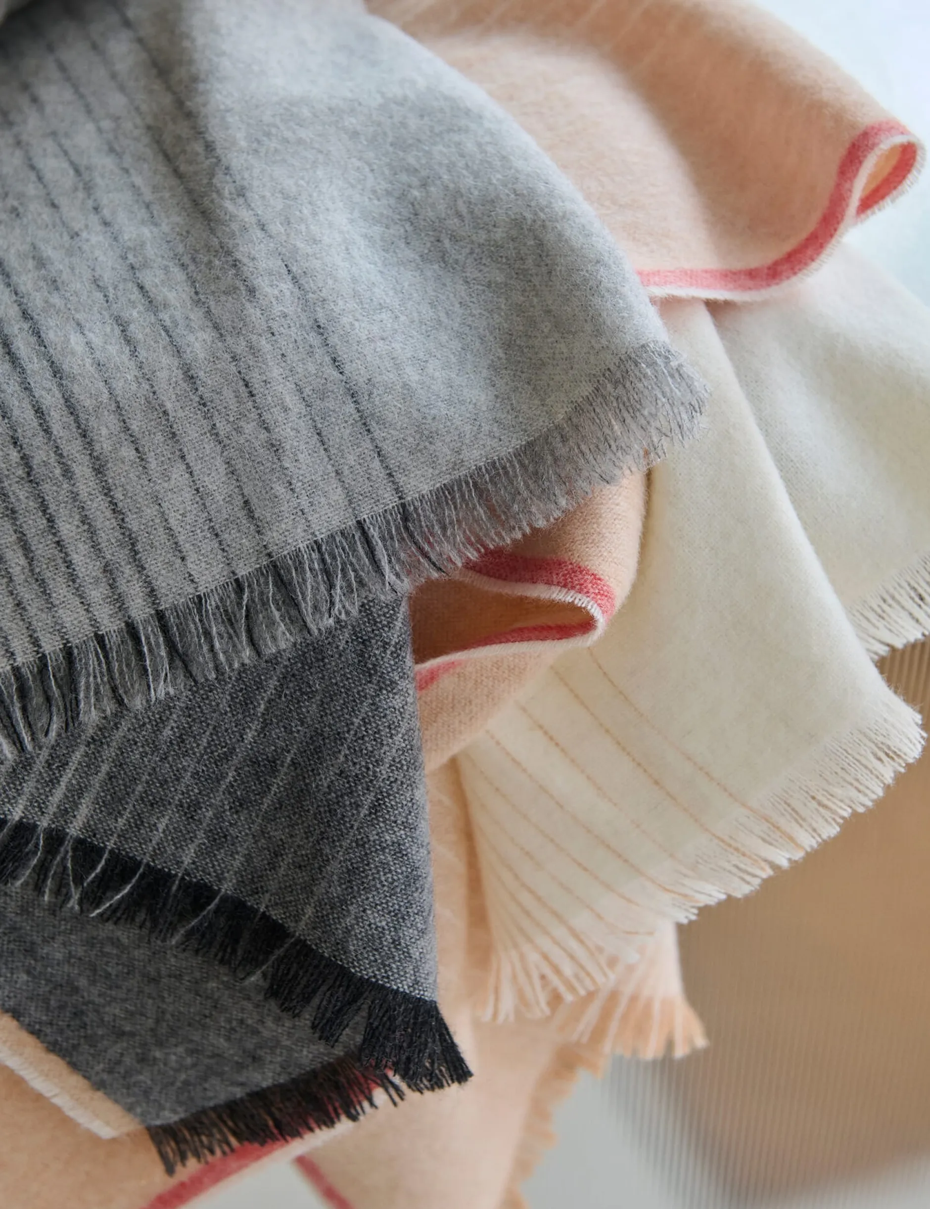 Elvang verwebt für diese warme, leichte Decke weiches Alpakahaar (50%) und strapazierbare Wolle (40%). Die Farbverläufe entstehen übrigens allein durch den Einsatz unterschiedlich gefärbter Garne. Das Material wird zu einem Gutteil aus den Schnitt- und Webresten gewonnen, die bei der Qualitätskontrolle sowie bei der Verarbeitung der Textilien vor Ort entstehen. So ist genau bekannt, um welche Art von Wollresten es sich handelt, nämlich nur um die selbst verarbeitete Wolle – hier sind es insgesamt 45 Prozent recycelte Alpaka- und Schafwolle. Die zusätzlich zur recycelten Wolle enthaltenen zehn Prozent Polyamid- und Acrylfasern sind der Konfektionierung geschuldet und können nicht heraussortiert werden. Dieser Anteil sorgt jedoch dafür, dass die Decke lange ihre Form behält.