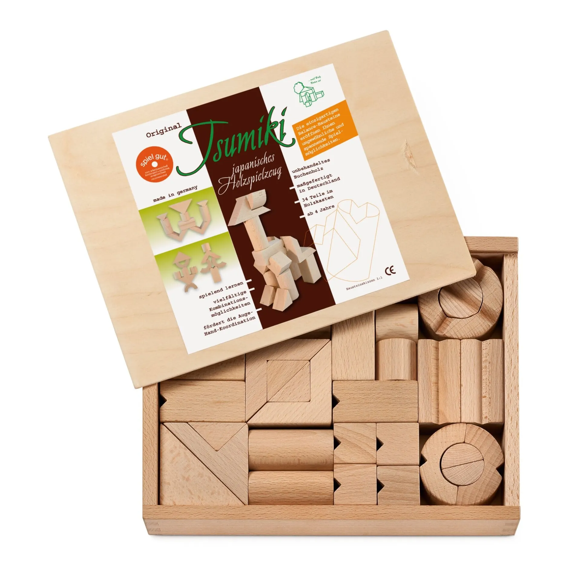 - Präzise gefertigt: 34 Holzbausteine aus unbehandeltem Buchenholz