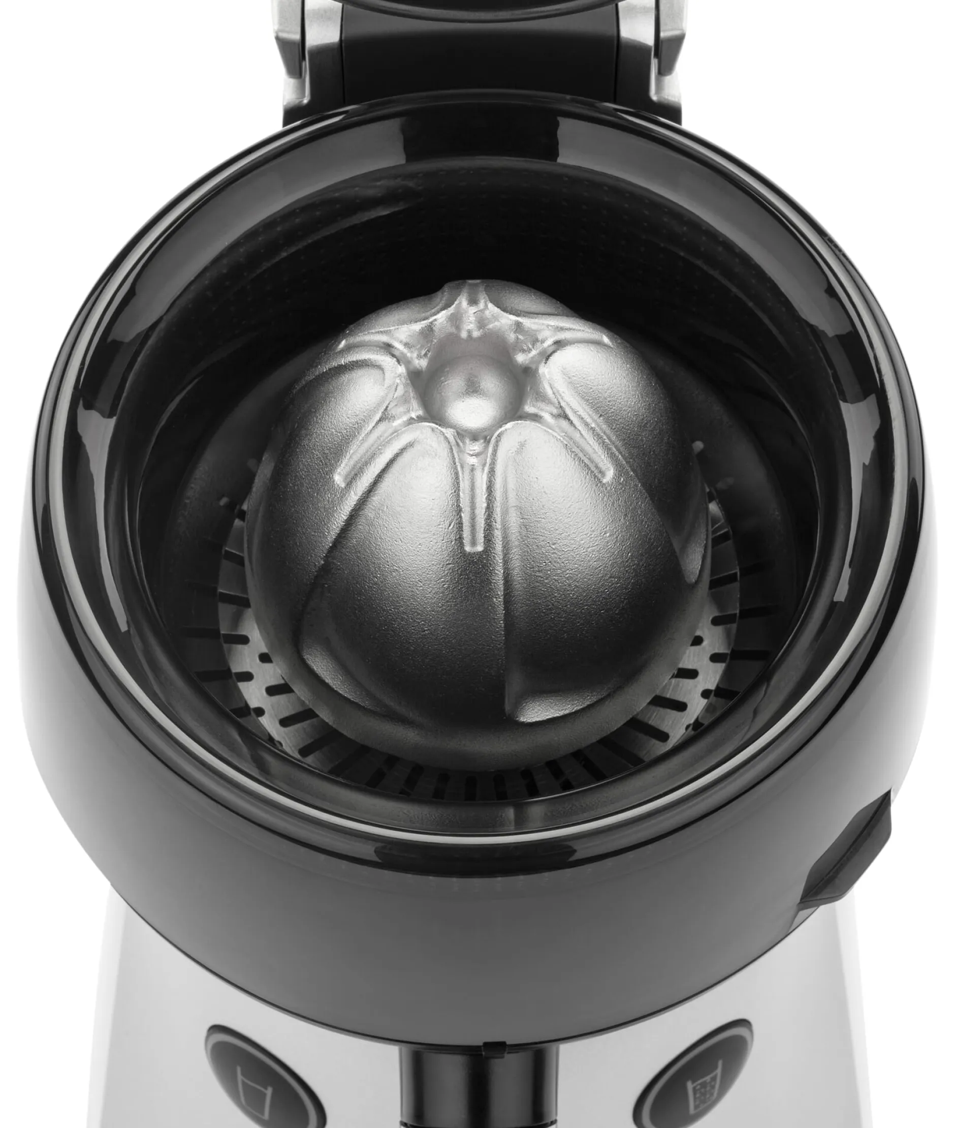 Der Juicer liefert frisch gepressten Orangensaft im Handumdrehen. Sie haben die Wahl: Soll es lieber ein vollmundig-fruchtiger Saft mit etwas mehr Fruchtfleisch sein oder ein erfrischend klarer Saft, der weniger Fruchtfleisch enthält? Diese elektrische Zitruspresse von Espressions in den Niederlanden kann beides. Betätigen Sie ganz einfach eine der beiden Vorwahltasten, bestücken den robusten Presskegel aus geschmacksneutralem Edelstahl mit einer halben Orange (Grapefruit, Zitrone oder Granatapfel sind auch möglich) und drücken den Bügel leicht herunter: Schon kommt die Frischeproduktion in Gang und der Kegel dreht sich entweder rechts- oder links herum um die eigene Achse.