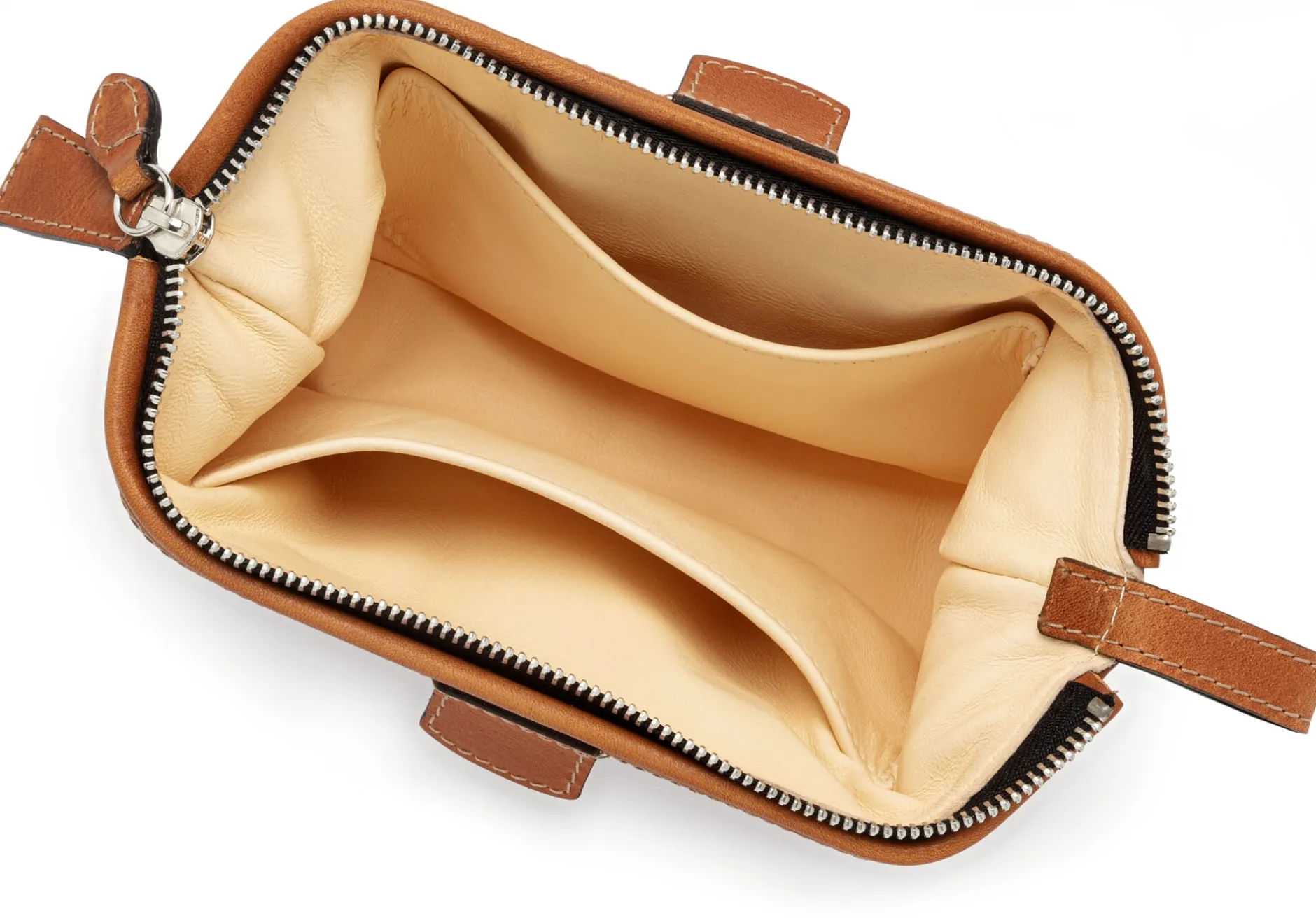 Der Korpus ist mit sauber eingeschlagenen Kanten gearbeitet, offene Lederkanten sind sorgfältig glattgezogen, gefärbt und gewachst, Lederbesätze schützen die Ecken. Innen ist die Schminktasche mit weichem, naturfarbenem Schafleder ausgeschlagen, das auch für die beiden an den Seiten eingearbeiteten Steckfächer verwendet wird. Der extrem robuste, breite Reißverschluss – ebenfalls selten bei Schminktaschen – kommt aus Italien, von einer Firma, die sonst Komponenten für militärische und geologische Ausrüster fertigt. Polierte Zähnchen sorgen dafür, dass er sehr leichtgängig ist.