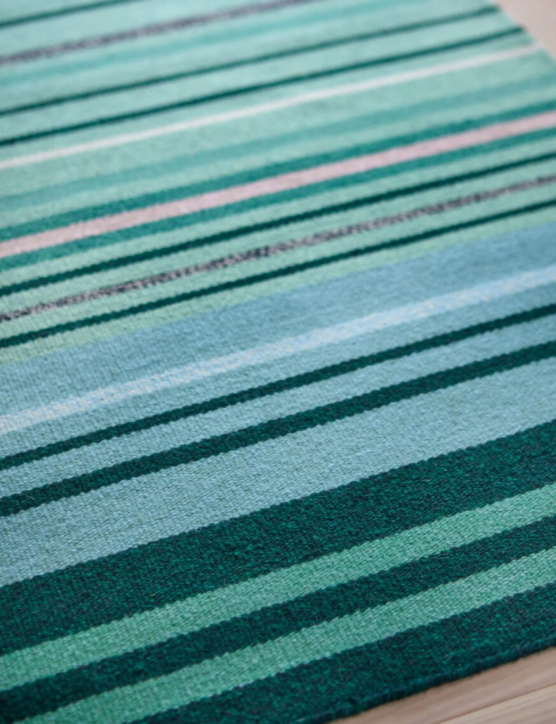 Der handgefertigte, flach gewebte Teppich GILLELEJE reiht Streifen in verschiedenen Grüntönen aneinander. Das gleichmäßig gewebte Material strahlt Ruhe und Frische aus. Bei der feingerippten Oberfläche bilden Kett- und Schussfaden eine leicht erhabene Struktur, die sich einfach reinigen lässt. Einsatz findet GILLELEJE als Läufer im Flur, Teppich vor dem Sofa oder auch in Bad oder Schlafraum.