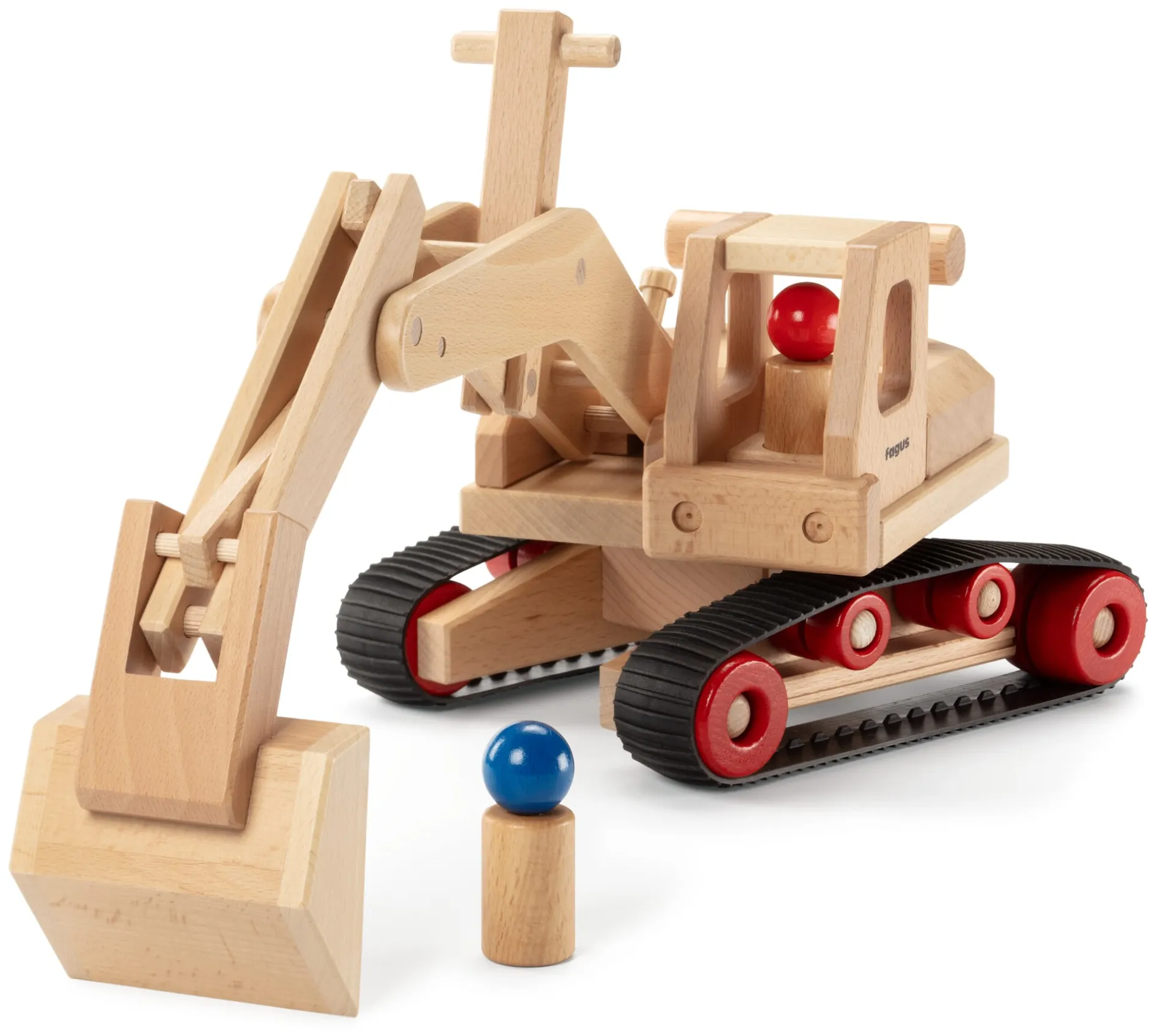Bagger mit zwei passenden Spielfiguren. Korpus und Figuren aus Buchenholz lackiert, Raupenketten aus Gummi. Grundfläche Unterwagen 22 × 17 cm. Inkl. Baggerarm maximale Länge 46 cm, maximale Höhe 41 cm. Gewicht 1,8 kg.