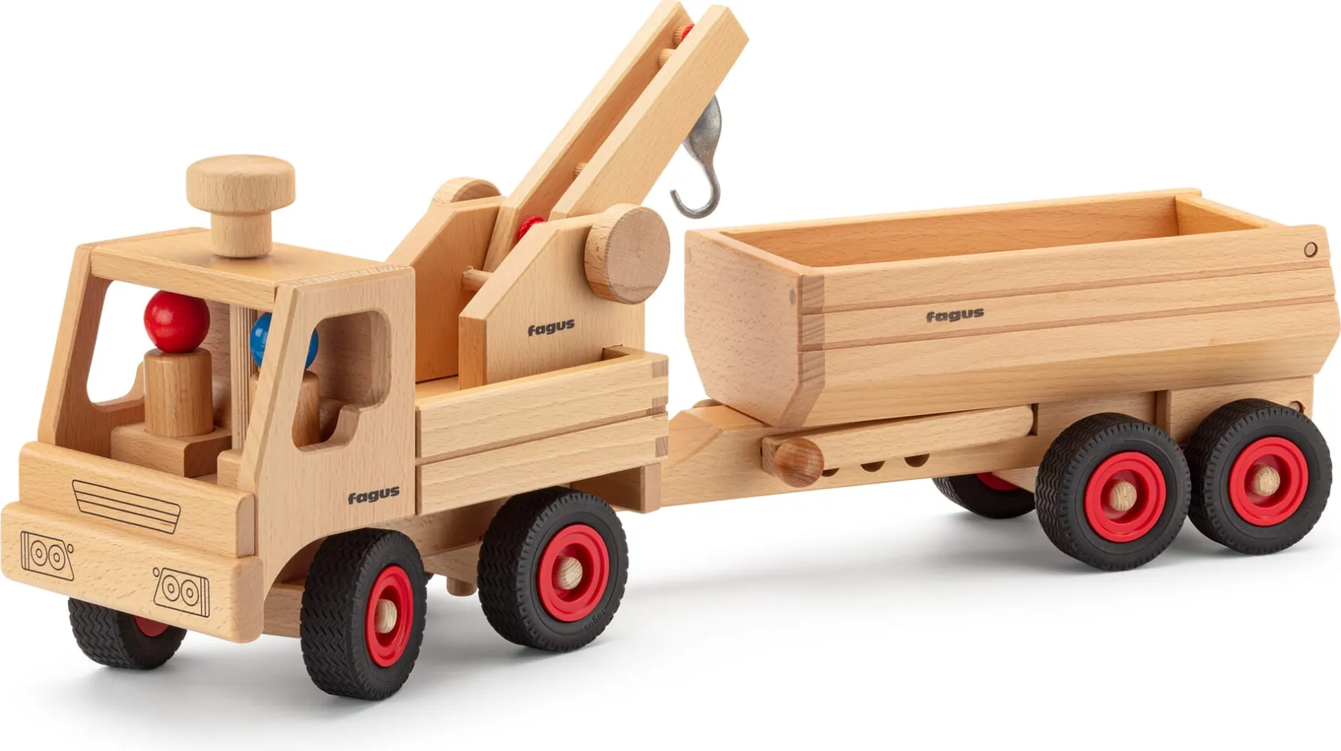 Ein charakteristisches Detail vieler Fagus Holzfahrzeuge ist der Knauf auf der Fahrerkabine, über den der Unimog gelenkt wird; auch beladen nimmt er per Knaufdreh die erwünschte Richtung ein. An die Anhängerkupplung kann zum Beispiel der Fagus Anhänger kippbar angekoppelt werden. Zwei passende Püppchen aus Buchenholz in der Rolle von Fahrer und Beifahrer sind im Lieferumfang enthalten.