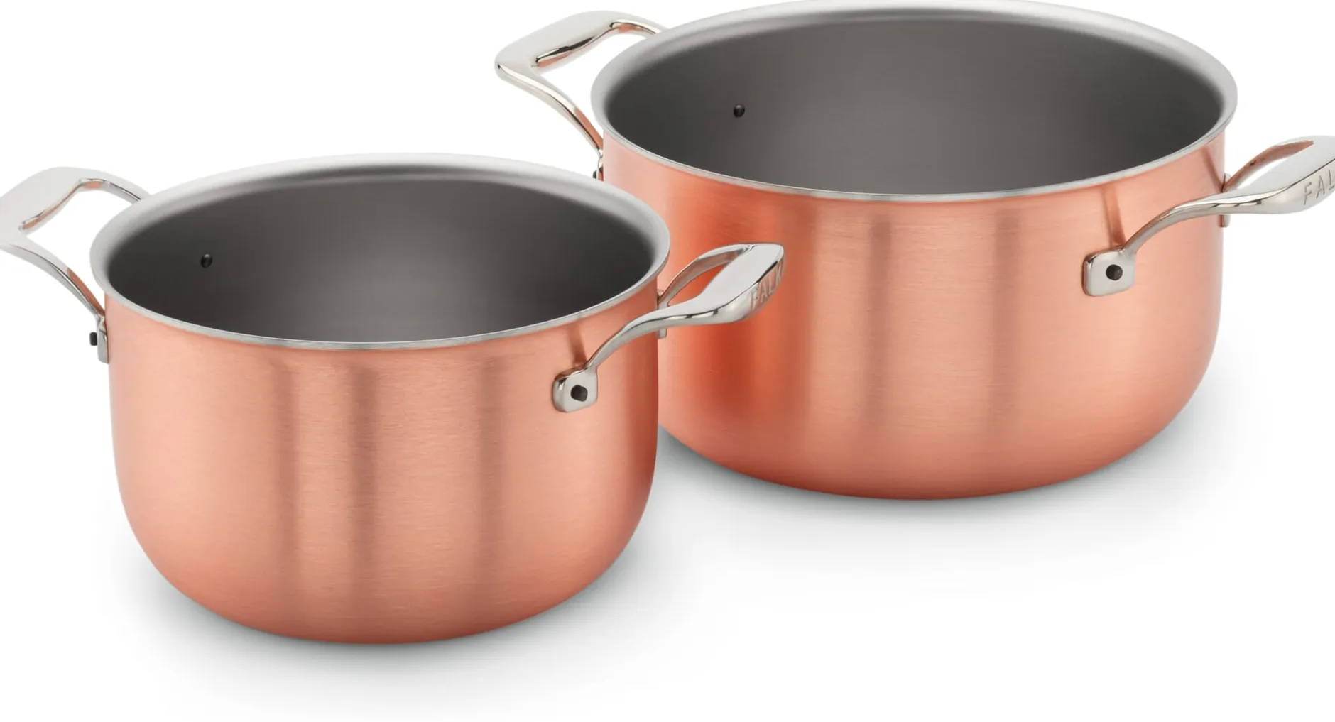 Mit Materialmischungen kennt die Firma Falk Culinair sich aus. Ursprünglich auf die Verarbeitung von Kupfer spezialisiert, zählt die Verwendung von sogenannten Bimetallen bei dem Kochgeschirrhersteller mit Sitz in der Nähe von Brüssel heute zu den Standards. Zumeist wird das Edelmetall mit dem eleganten Aussehen durch Walzen mit einer Lage (innen) oder zwei Lagen (außen und innen) Edelstahl verbunden. Das ist der Klassiker. Bei dieser neuen, Cuvée genannten Topfserie ist der Materialmix anders: insgesamt leichter, deshalb aber keinesfalls weniger funktional – und somit in den Kocheigenschaften sehr wohl vergleichbar und an unsere heutigen Kochgewohnheiten angepasst. Denn zu Kupfer (außen) und Edelstahl (innen) gesellt sich eine dünne Lage Aluminium in der Mitte. Die Leiteigenschaften von Aluminium sind ähnlich wie die von Kupfer, sodass eine gleichmäßige Verteilung der Wärme vom Topf- oder Pfannenboden bis in die Randflächen gesichert ist. Wie beim traditionellen Kupfergeschirr bilden sich keine Wärmeinseln. Und auch in dieser Dreier-Kombination reagiert das Geschirr verlässlich kurzfristig auf Zufuhr oder Minderung von Wärme – ideal auf Gas, aber dank einer außen am Boden aufgesprühten Schicht aus ferromagnetischem, poliertem Eisen auch für den Induktionsherd geeignet. Henkel und Griffe werden als Hohlgriffe aus Edelstahl ausgeführt, das hat den Vorteil, dass sie sich (da Edelstahl unter den dreien das am wenigsten wärmeleitende Material ist) kaum mitaufheizen und auch ohne Topflappen angefasst werden können. Darüber hinaus ist dieses Kochgeschirr sogar ofenfest.