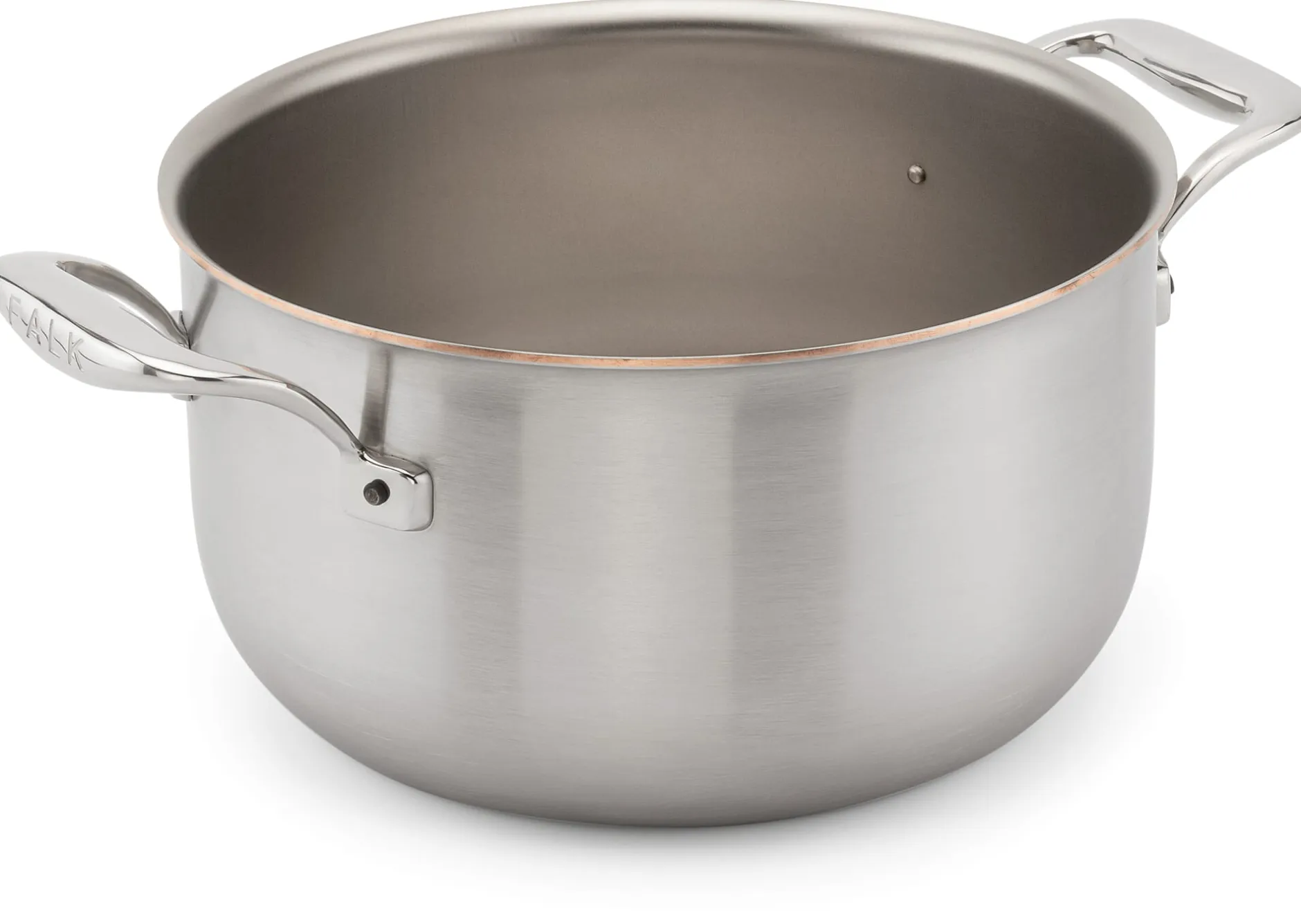Edelstahl 18/8 und Kupfer. Genietete Edelstahlgriffe. Volumen 4,8 l. Boden Ø 19 cm, Ø oben 24 cm. Randhöhe 13,5 cm. Breite 35 cm. Gewicht 3 kg. Lieferung ohne Deckel.
