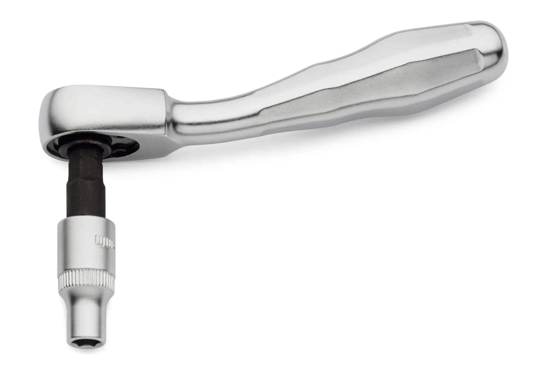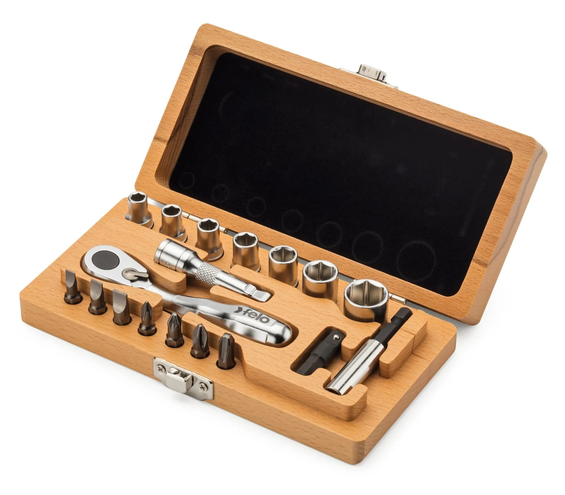 Werkzeuge aus Chrom-Vanadium-Stahl. 1 Miniratsche (1/4-Zoll) und 1 Verlängerung, 7 Steckschlüsseleinsätze (5; 5,5; 6; 7; 8; 10; 13); 1 Bithalter mit Adapter und Bithalterverlängerung, 7 Bits (3 Schlitz, 4 Kreuz). Gesamtgewicht 475 g. Lieferung in einer Buchenholzkiste (Tiefe 9 cm, Breite 16 cm, Höhe 3,5 cm).
