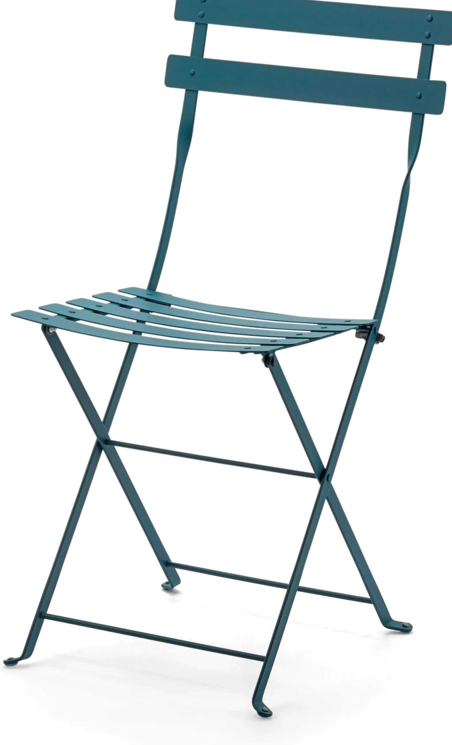 Dieser Stuhl ist die Neuauflage eines Modells, das in Frankreich 1889 zum Patent angemeldet wurde. Der zierliche, doch robuste Klappstuhl „Simplex“ verhalf seinerzeit den Limonadenverkäufern entlang der Seine in Paris zu gesteigerten Einnahmen, denn dank mobiler Bestuhlung konnten sie sich die Gewerbesteuerausgaben sparen, die sie sonst für eine bewirtschaftete Außenterrasse hätten zahlen müssen. Heute ist der Bistrostuhl mit der schmalen Silhouette ein begehrtes Balkon- und Gartenmöbel. Abgeflachte Verdrehungen im Gestell unterhalb der Rückenlehne stabilisieren die Konstruktion, die Traverse – das bei der Betätigung des Klappmechanismus meistbeanspruchte Teil – ist aus einem Stück gefertigt und in einer Weise befestigt, die Schweißnähte, Niete oder Verschraubungen (mögliche Schwachstellen also) überflüssig macht. Die Latten von Sitzfläche und Rückenlehne sind leicht gewölbt und ermöglichen komfortables Sitzen, die vier Füße sind zum Schutz vor Lackschäden und Verkratzen mit Kunststoffkäppchen versehen.