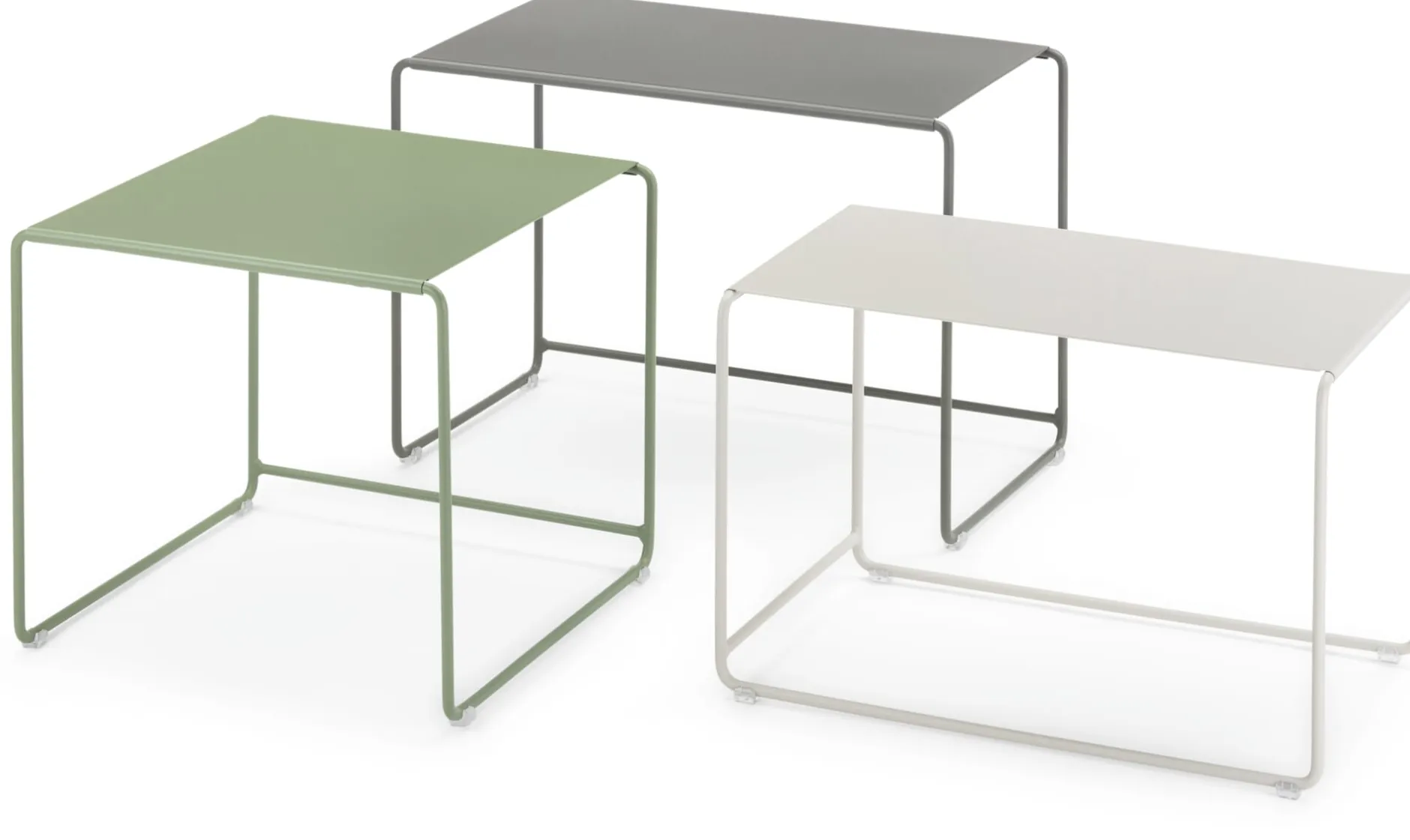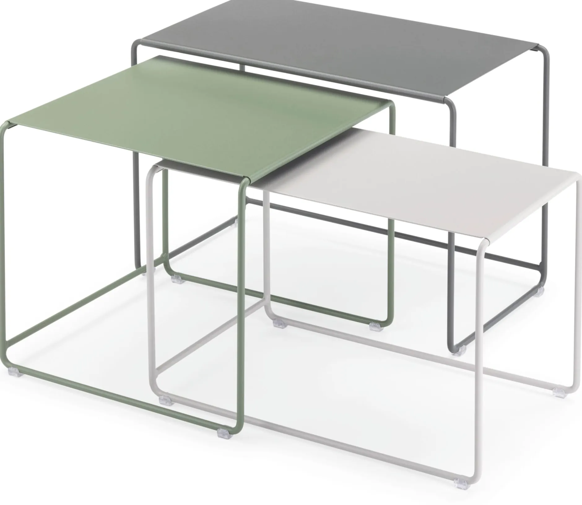 3er-Set. Tischplatte aus Stahlblech. Gestell aus Stahldraht. Polyesterpulverbeschichtung. Möbelgleiter aus Kunststoff. Großer Tisch: L 55 × B 30 × H 40 cm. Gewicht 3,7 kg. Mittlerer Tisch: L 50 × B 30 × H 34 cm. Gewicht 3,5 kg. Kleiner Tisch: L 40 × B 40 × H 37 cm. Gewicht 3,5 kg. Max. Belastungsgewicht 130 kg. Hergestellt in Frankreich.