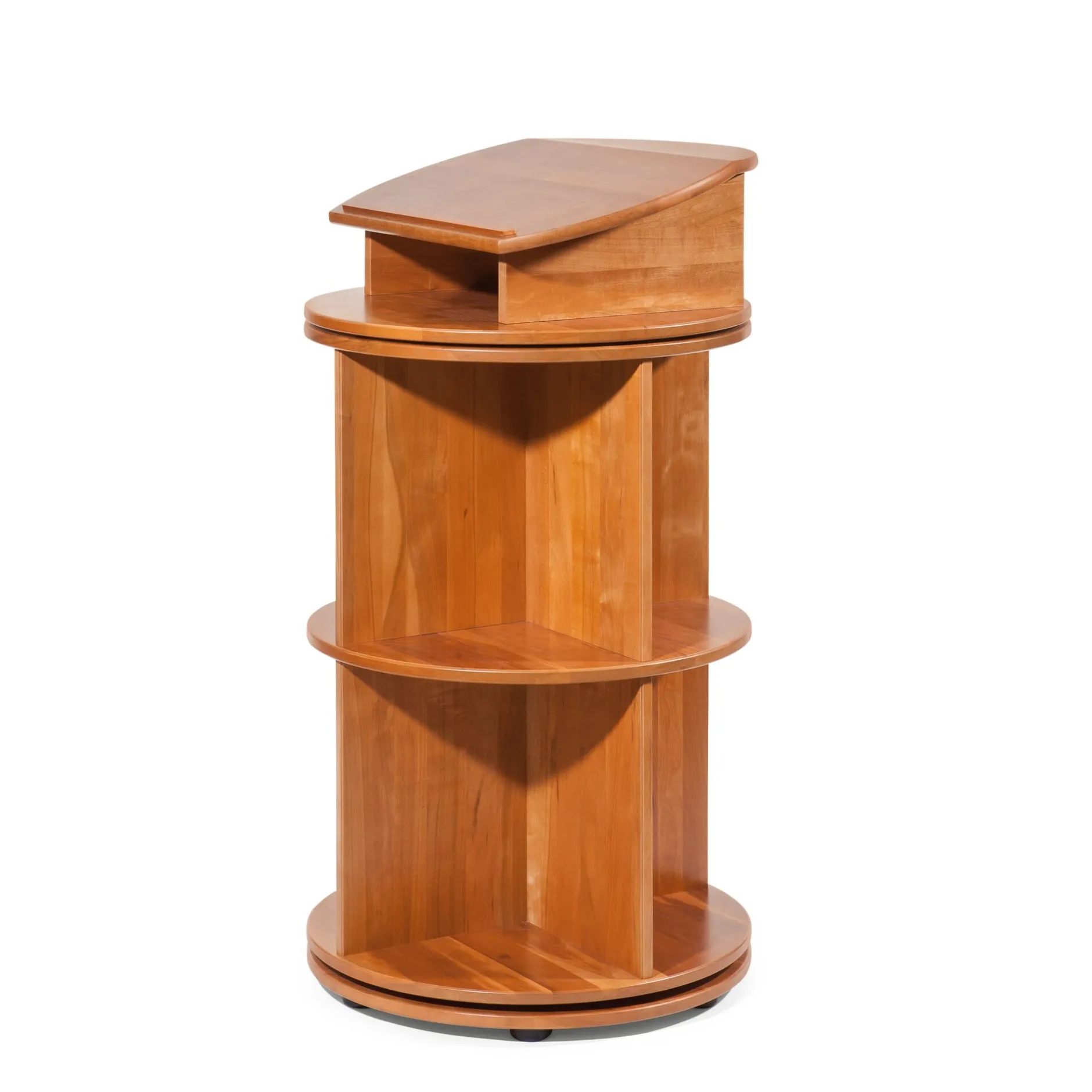 Unser Bücherkarussell birgt im Sockel einen kugelgelagerten Drehbeschlag, auf dem der Turm sich dreht. Ein Aufsatz mit um 15 Grad schräggestelter Arbeitsfläche macht das zweistöckige Karussell zugleich zu einem Stehpult.