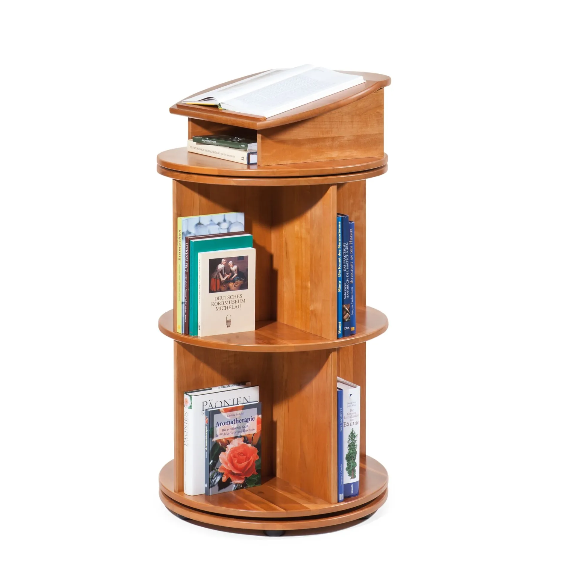 Das Prinzip wird in Bibliotheken und Archiven seit langem genutzt; raumsparender lassen sich Bücher und Ordner nicht aufbewahren als in einer drehbaren Säule, die bei geringster Grundfläche ein Maximum an Stellplatz bietet. Unser Bücherkarussell – zwei-, drei- oder vierstöckig – hat in der zweistöckigen Variante zusätzlich einen Pultaufsatz und wird damit zu einem überaus ansehnlichen und praktischen Mittelpunkt jedes Arbeitszimmers. Geschreinert wird das Bücherkarussell aus massiver Feuerlandkirsche, dem Holz, aus dem auch unsere Registratoren gebaut sind. Die Sockelplatte birgt einen massiven, kugelgelagerten, bis 300 kg belastbaren Aluminium-Drehbeschlag, über den der gesamte Turm leicht dreht. Jede Etage bietet eine nutzbare Stellhöhe von 39 cm bei einer nutzbaren Stellbreite pro Etage von insgesamt ca. 100 cm.