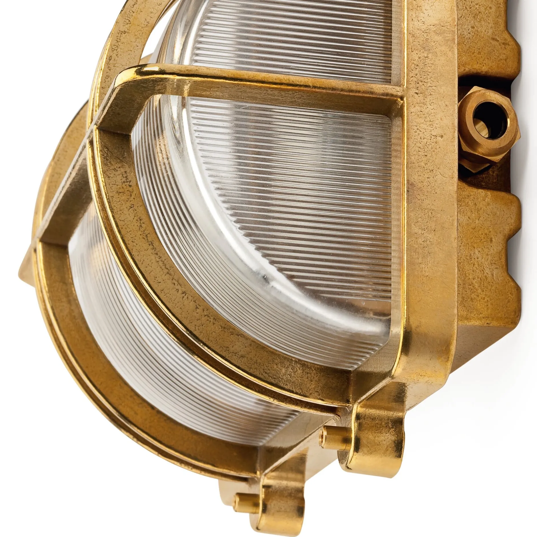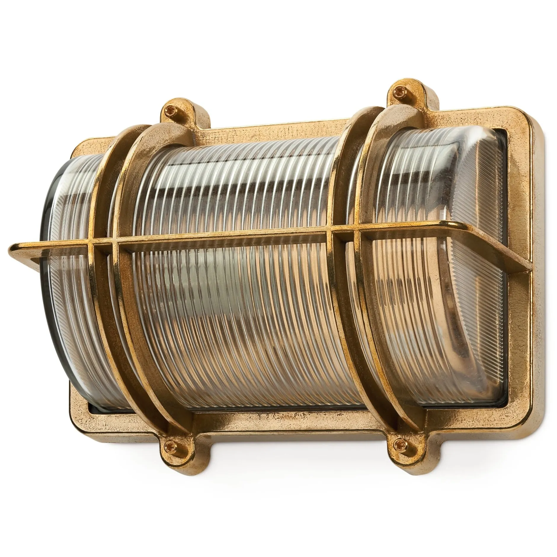 Mit Korpus aus Messingguss, Kuppel aus geriffeltem Pressglas. Keramikfassung E27 (max. 60 W). IP 54. Ohne Leuchtmittel und Befestigungsmaterial. Länge 26 cm, Breite 21,5 cm, Tiefe 13,5 cm. Gewicht 3,7 kg.