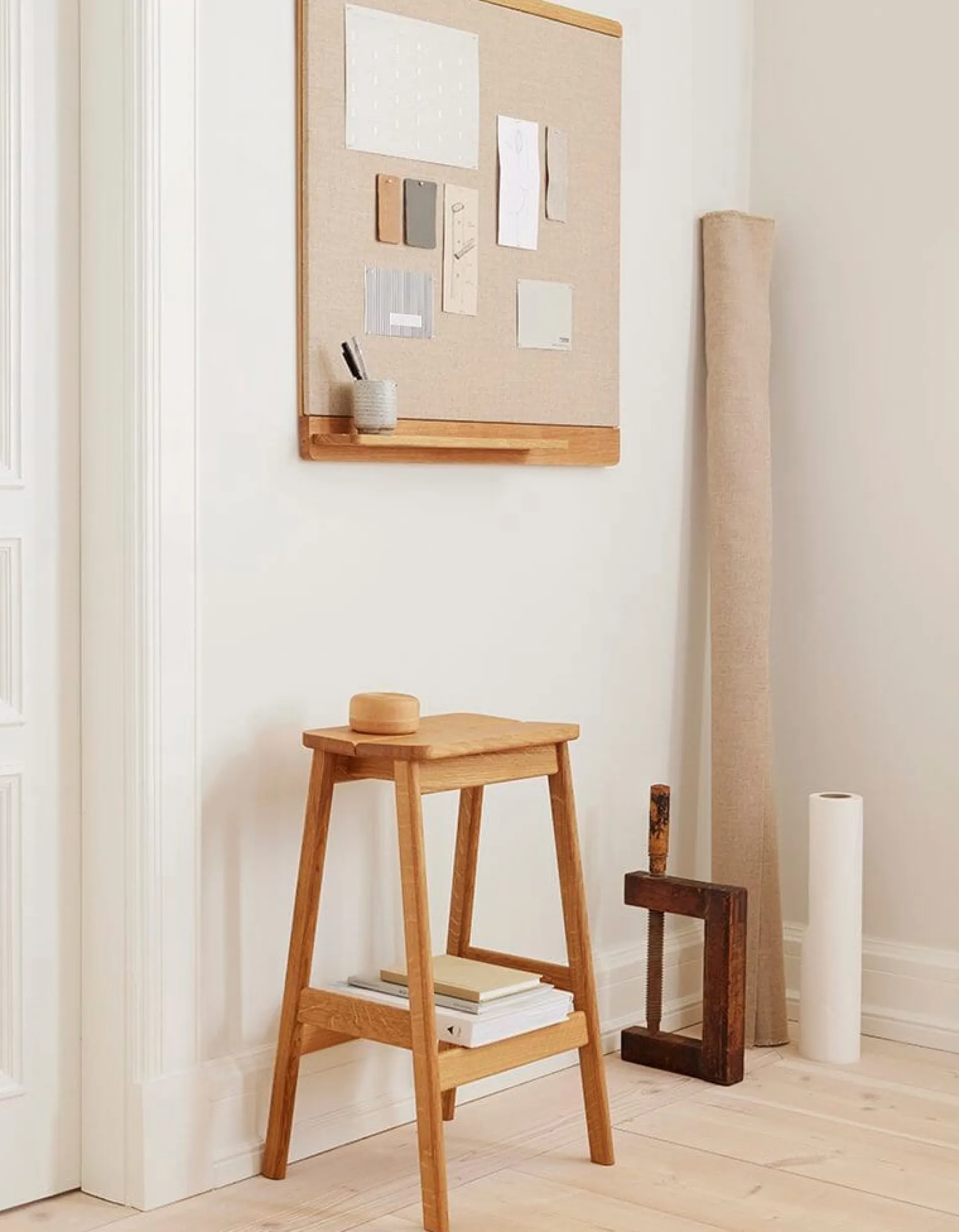 Handwerklich souverän aus massivem, geöltem Eichenholz gebaut, hält der Rahmen eine solide Holzfaserdämmplatte vor, auf die ein etwas gröberes Gewebe aus recyceltem Leinen aufgezogen ist. Heftzwecken, Pins und Stecknadeln haften bestens in dieser Kombination von Faserplatte und Leinwand, die beide materialtypisch sehr robust und langlebig sind. Mit einer Fläche von 75 × 75 Zentimetern verfügt die Pinnwand zudem über die optimale Größe, um über Schreibtisch, Flurkonsole oder Küchentisch alles Erinnerungswürdige aufzunehmen, ohne den Rahmen von Raum (und Zeit) zu sprengen. Dazu trägt auch ihre angenehm reduzierte Gestaltung bei, die in der Tradition von Shaker, Bauhaus & Co. ganz der Funktion folgt und daher die Ablage nicht vergisst, auf der unter anderem Notizzettel und Stifte deponiert werden können.