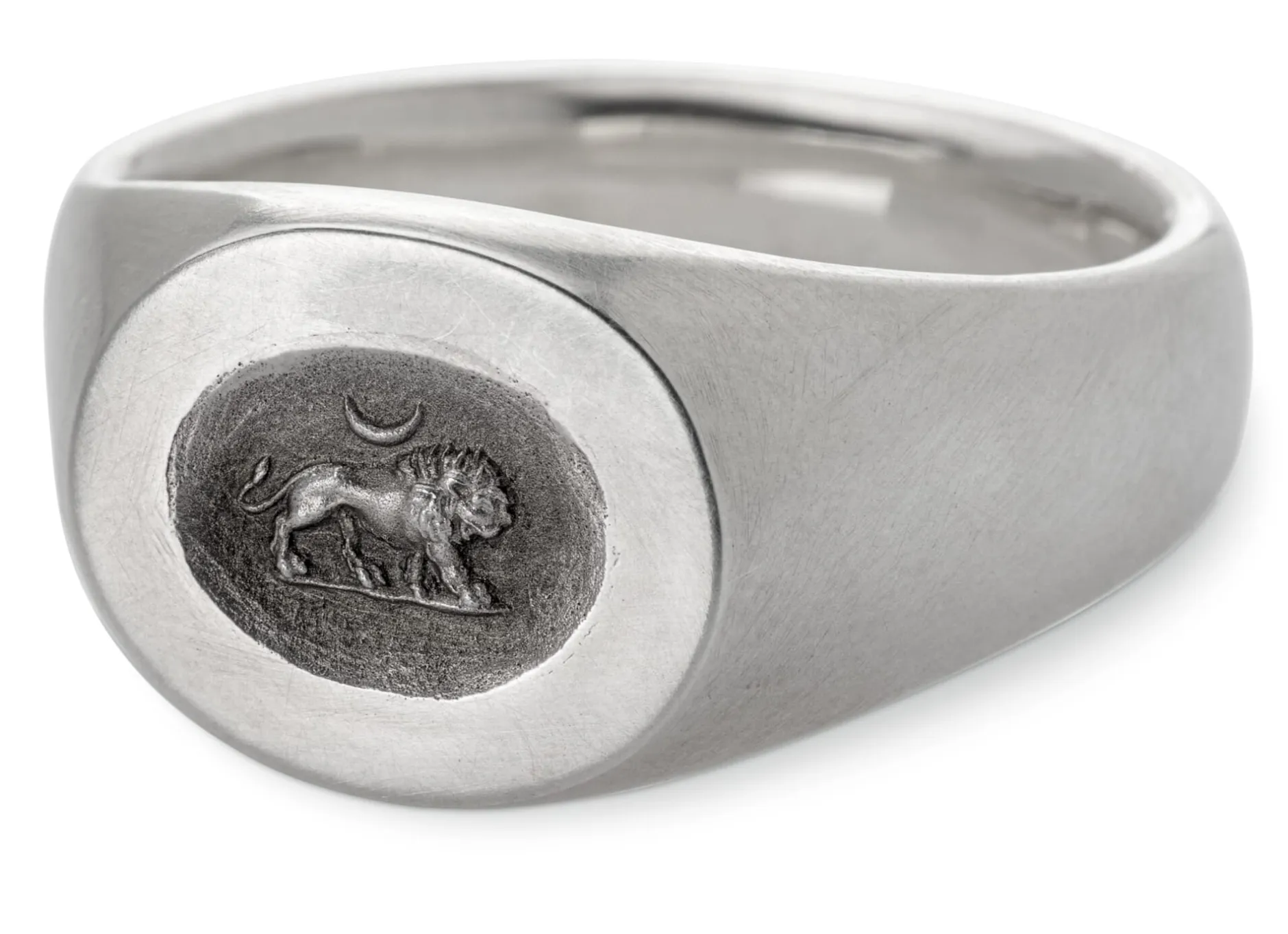 Dieser schnörkellose Ring aus massivem, gebürstetem 925er Silber zeigt im Ringkopf den Abguss einer römischen Gemme aus dem 2. bis 3. Jahrhundert unserer Zeitrechnung: Zu sehen ist ein schreitender Löwe unter einer Mondsichel, welche die ganze Szenerie dem Profanen ent- und in himmlische Sphären erhebt. Die Ringschiene ist auf der Innenseite poliert, wodurch der Ring angenehm glatt auf der Haut liegt.