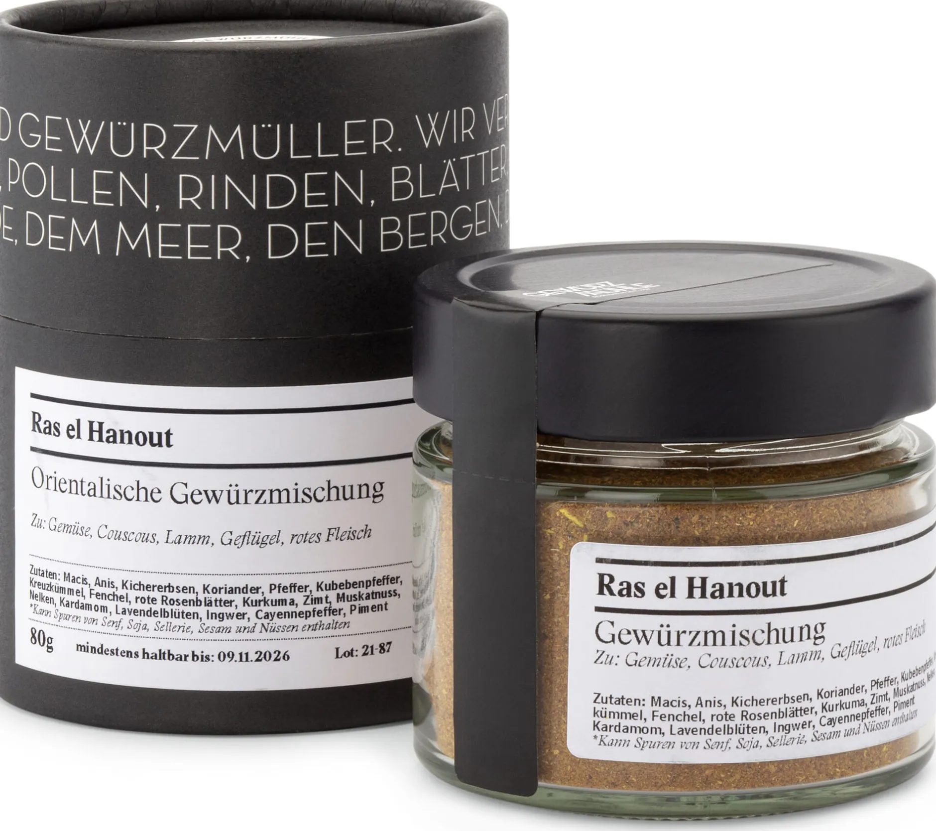 Ras el Hanout ist ein wahrer Schatz in der Gewürzwelt und jeder Löffel davon ist wie eine Reise durch die bunten Souks und Gewürzmärkte Nordafrikas und des Nahen Ostens. Das intensive Aroma und die harmonische Kombination süßer, herber, floraler, würziger und leicht scharfer Noten von Ras el Hamout macht jedes Gericht zu einer wahren Gaumenfreude. Kein Wunder, dass die ursprünglich aus dem Maghreb stammende und aus bis zu 30 Zutaten bestehende Mischung (frei übersetzt: „Chef des Ladens“) das Aushängeschild vieler arabischer Gewürzhandlungen ist. Bei der Ras-el-Hanout-Mischung aus der Gewürzmühle Rosenheim sind es 17 Gewürze – und die haben es in sich: Macis, Anis, Kichererbsen, Koriander, Pfeffer, Kreuzkümmel, Fenchel, rote Rosenblätter, Zimt, Muskatnuss, Lavendelblüten, Nelken, Kurkuma, Kardamom, Ingwer, Cayennepfeffer und Piment. Das Ras el Hanout verleiht Tajine- und Couscousgerichten eine besondere Tiefe, es gibt Reis, Ofenkürbis, Blumenkohl und Wurzelgemüsen Pfiff und es würzt Geflügel, Lamm, Zicklein und Wildgerichte.