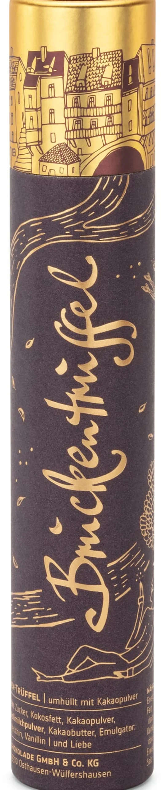 Die Brückentrüffel sind ein echter Klassiker aus der Goldhelm Schokoladenmanufaktur. Die mundgerechten Würfel zeichnen sich durch einen feinen Schmelz und einen köstlichen Schokoladengeschmack aus, der von dem dunklen Kakao, mit dem sie umpudert sind, perfektioniert wird. Hier kommen die Trüffel in einer stabilen Kartonrolle, die nicht nur schön anzusehen ist. Es gibt sogar Menschen, die diese Rolle nach dem Genuss der Trüffel einer Zweitverwendung als Stifteköcher zuführen.
