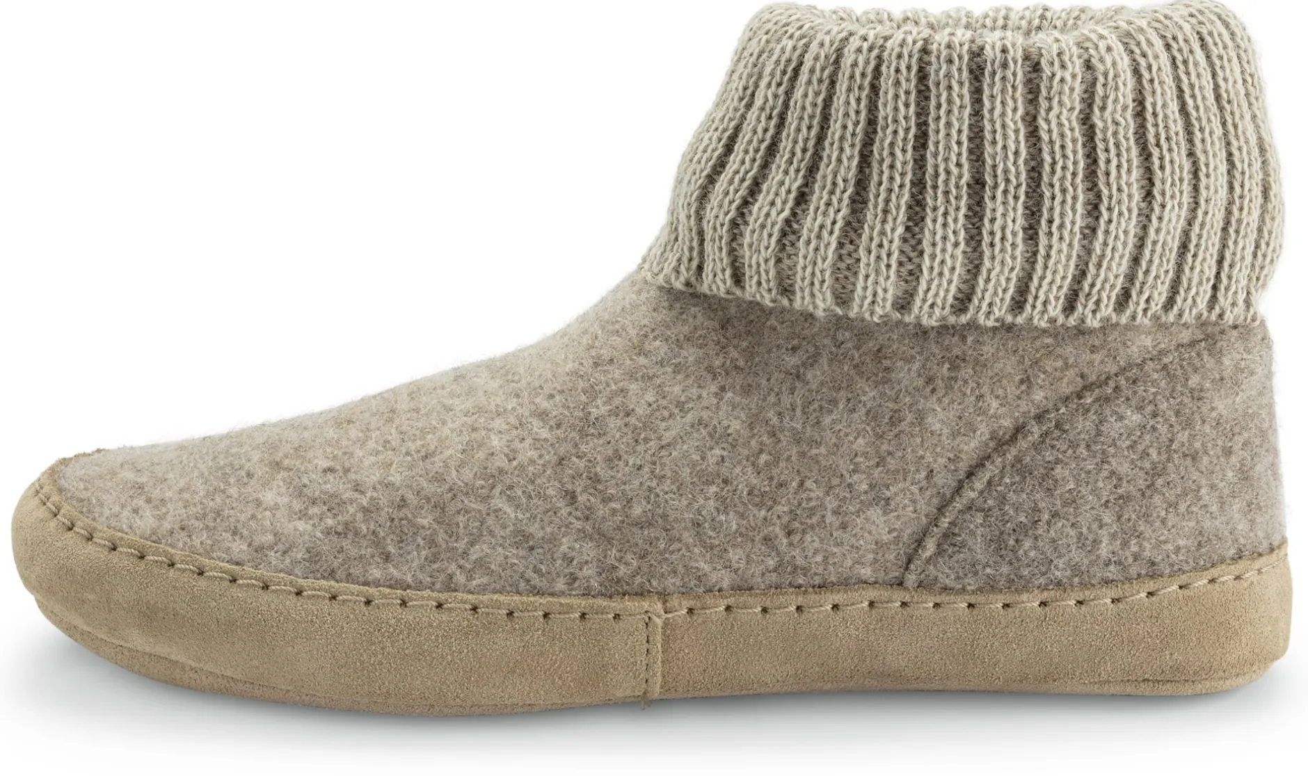 Ein weicher und wärmender Hüttenschuh, der den Fuß bis hoch zum Knöchel umschließt. Obermaterial, Futter und Decksohle sind aus Wollwalk, der aus reiner Schurwolle besteht. Der anschmiegsame und fußklimatisch günstige Wollwalk wird schuhmacherisch auf einem Leisten geformt, wodurch 1) eine optimale Passform erreicht wird und 2) praktisch kein Wollabfall entsteht. Die Stulpen in markanter Rippenstricktechnik sind umgeschlagen, was am Knöchel zusätzlich wärmt. Gottstein empfiehlt, die Stulpen vor dem Anziehen hochzuschlagen und anschließend wieder umzuklappen. Die Rauledersohle mit umlaufendem Rand schützt den Wollwalk beim Gehen, zugleich gibt sie Halt auf den meisten Untergründen.