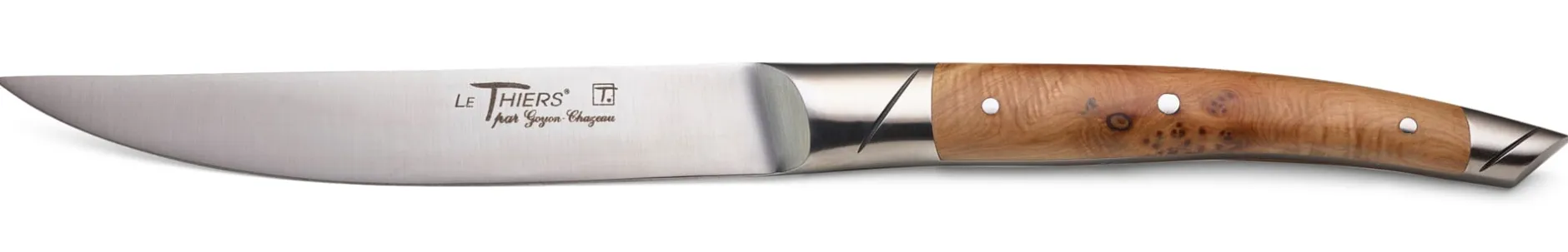 Dieses Messer ist eine Schmiedearbeit aus der Messermanufaktur Goyon-Chazeau nahe Thiers. In dem Ort in Zentralfrankreich ist die Kunst der Messerherstellung seit dem 14. Jahrhundert fest verwurzelt. Jedoch darf lange nicht jedes Messer von dort auch diesen Titel tragen: Le Thiers®, heute ein geschützter Begriff. Strenge Qualitätskriterien müssen erfüllt sein, die sich auf ihre Fertigung, Form und Handhabung beziehen. Und schon das reine Gewicht unseres Steakmessers ist ein Zeichen dafür, dass die geschärfte Klinge und der Griff aus einem Stück rostfreiem Stahl geschmiedet sind – eine präzise Handarbeit, die selbstverständlich erfahrenen Meistern ihres Fachs vorbehalten ist. Mehr als 20 Jahre ist dieses Messer im Programm des Schmiedebetriebs. Seine Gestaltung folgt einem Entwurf der Messermacher-Gilde in Thiers. Die Griffschalen – bei unserem Messer sind sie aus Wacholderholz – werden passgenau eingesetzt.