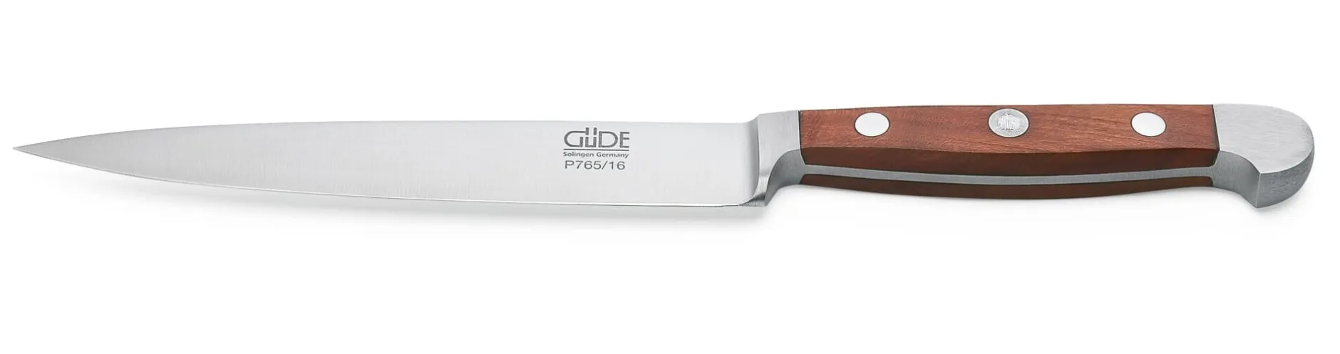 Bei diesem geschmiedeten Messer aus dem 1910 gegründeten Solinger Betrieb von Franz Güde ist am Ende des Griffes ein zweiter Kropf ausgeschmiedet; dieses zusätzliche Gewicht verlagert den Schwerpunkt des Messers nach hinten und gibt ihm damit eine überlegene Balance. Alle Güde-Messer sind aus rostfreiem Messerstahl, eisgehärtet (56 HRC), handabgezogen und handgeschärft. Wir bieten sie in zwei Varianten an: mit Griffschalen aus Pflaumenbaumholz und – wie bei Profimessern aus hygienischen Gründen schon lange üblich – mit solchen aus dem thermoplastischen Kunststoff Polyoxymethylen (POM). Alle Griffschalen sind mit Edelstahlnieten befestigt.