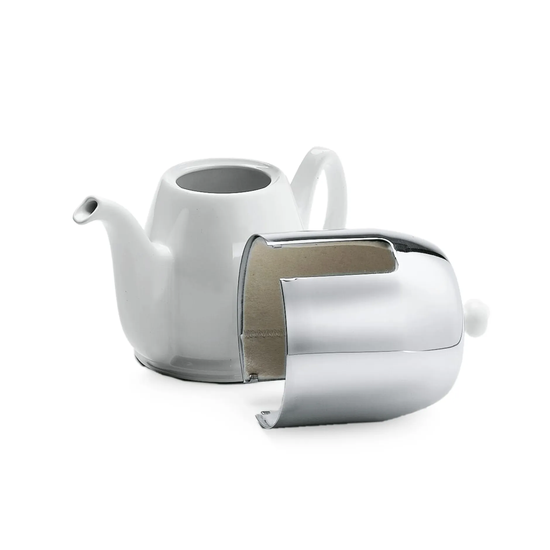 Das Prinzip ist einfach: Zur Kanne aus weißem Porzellan gesellt sich eine genau passende Haube aus bekanntlich nicht gut wärmeleitendem Edelstahl, die innen mit einem Filz (aus 100%Polyester) ausgeschlagen ist. Dies bewirkt eine äußerst effektive Isolierung und unter dem Mantel bleibt, was in der Kanne ist – Kaffee oder Tee –, längere Zeit warm. Übrigens: Mit dem Knauf aus Porzellan ist die Mantelkanne nur bei uns zu haben.