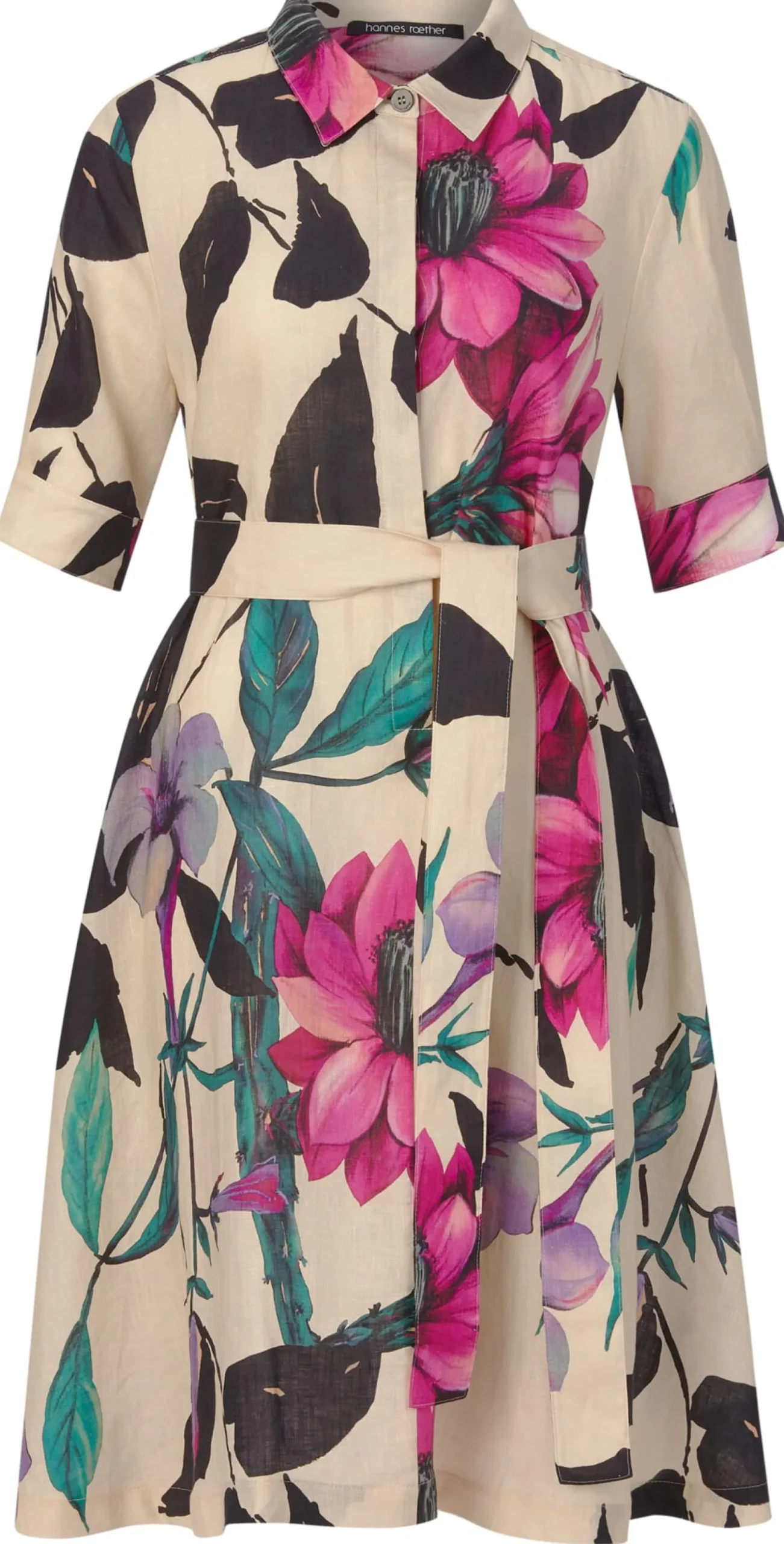 Farbenfrohes Kleid mit großblumigem Muster aus reinem Leinen – besonders an warmen Tagen ein komfortabler Begleiter. Denn Leinen kann viel Feuchtigkeit aufnehmen, ohne sich dabei feucht anzufühlen, und gibt diese auch schnell wieder nach außen ab, was einen kühlenden Effekt auf der Haut bewirkt. Das ungefütterte Kleid ist mit Hemdkragen, verdeckter Knopfleiste, zweifach geknöpften Manschetten und einem weit schwingenden Tellerrock gearbeitet. Es ist insgesamt leger geschnitten, für eine feminine Note lässt es sich aber mit dem Gürtel aus Oberstoff entsprechend taillieren. Die aufspringende Kellerfalte unter der Schulterpasse sorgt für mehr Bewegungsfreiheit. Zwei in die Seitennaht eingesetzte Taschen bieten Platz für Kleinteile des täglichen Gebrauchs.