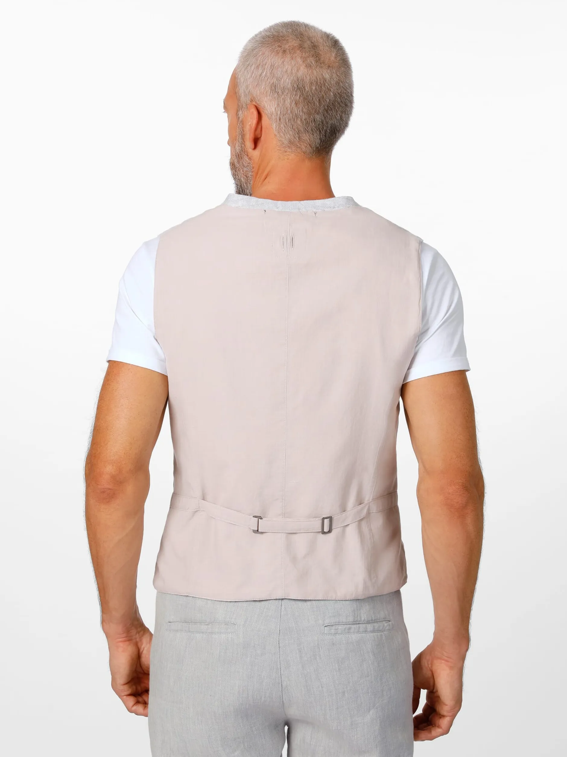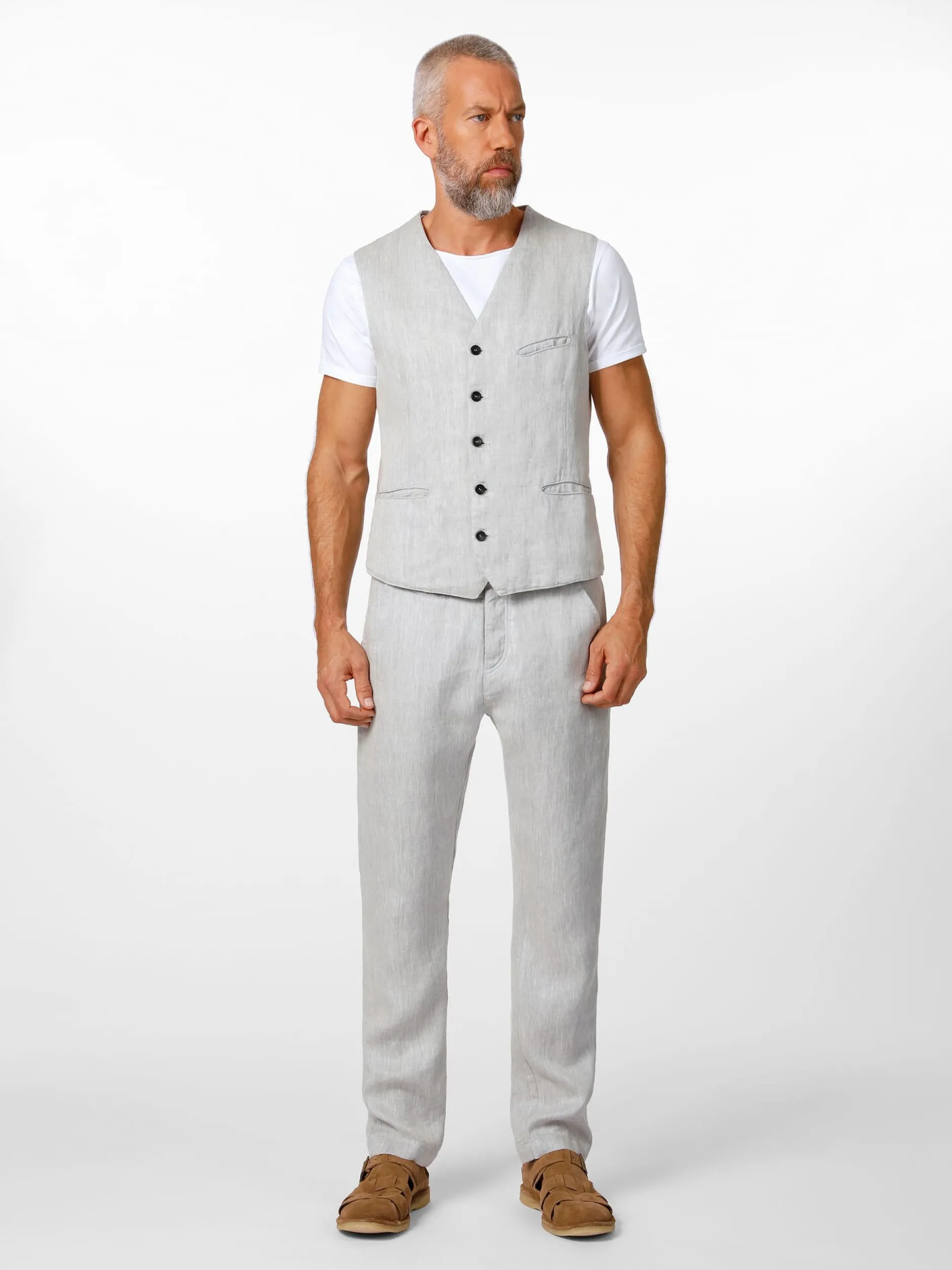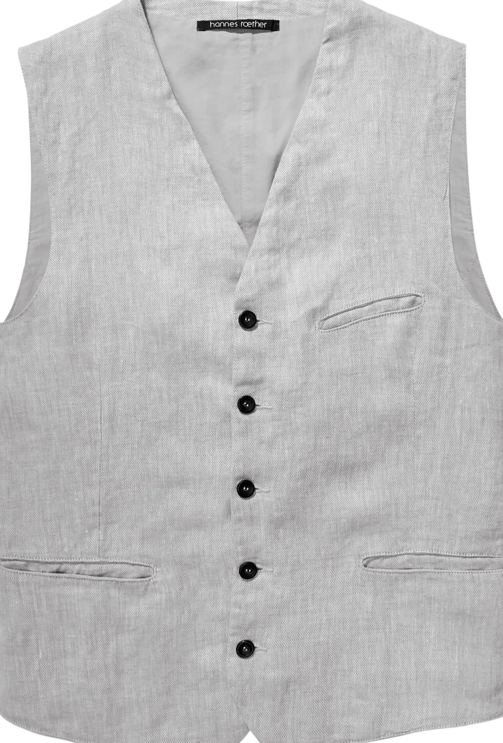 Das Vorderteil dieser kragenlosen Weste besteht aus Leinen in Naturtönen. Es ist in Köperbindung gewebt und zeigt neben dem markanten, diagonal verlaufenden Köpergrat einen schönen Melangeeffekt. Futter und Rücken der Weste bestehen aus hautsympathischer Baumwolle. Drei eingesetzte Taschen nehmen Kleinteile des täglichen Bedarfs auf. Ein Stoffriegel mit Metallschließe im Rücken erlaubt eine Anpassung der Taillenweite.